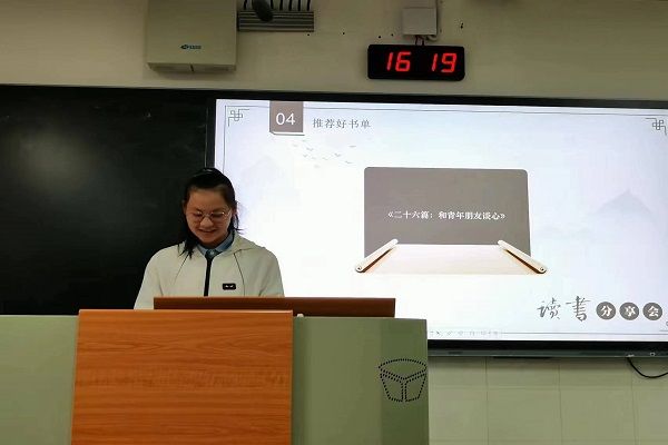 活动伊始,在阅读小组组长朱羿晓的主持下,3位阅读小组成员向同学们分享了《第七天》《二十六篇:和朋友谈心》《月光与六便士》等书籍的阅读心得。成员们分别从书本和作者简介、名篇佳句选读、推荐理由等方面,结合自身实际和日常学习生活,畅谈阅读后的所思所悟。参加活动的学生也围绕书籍阅读和自身心得展开交流讨论,在思想的碰撞中增长知识、凝聚力量。