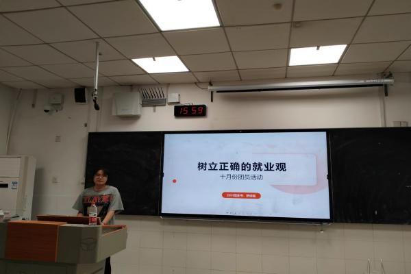 此次活动中,团支书罗佳铭充分准备了PPT和相关事迹,并在化工院团委组织部与基建部学长学姐的帮助与指导下,顺利完成了此次活动,让大家悉知了正确就业观的重要性。在此次活动中,罗佳铭以先择业后就业和先就业后择业两种情况为框架,并结合视频解说及相关数据来表达自己的见解。全体成员听讲投入,反应积极,大家都深思了自己心中的就业观。