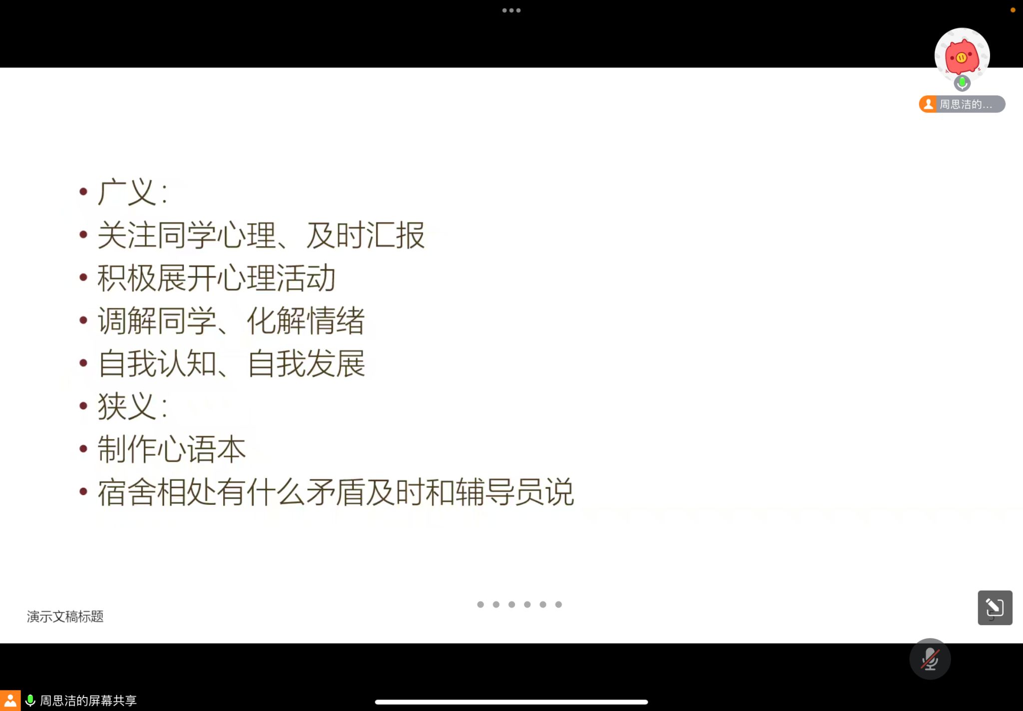 此次线上会议旨在为各位朋辈心理辅导员讲解本职务所需要承担的职责,并告知各位朋辈心理辅导员今后所需要开展的工作,同时,此次会议通过解答疑惑的形式来帮助各位朋辈心理辅导员能够更好的开展工作,加强了化工院关于心理健康方面的建设。