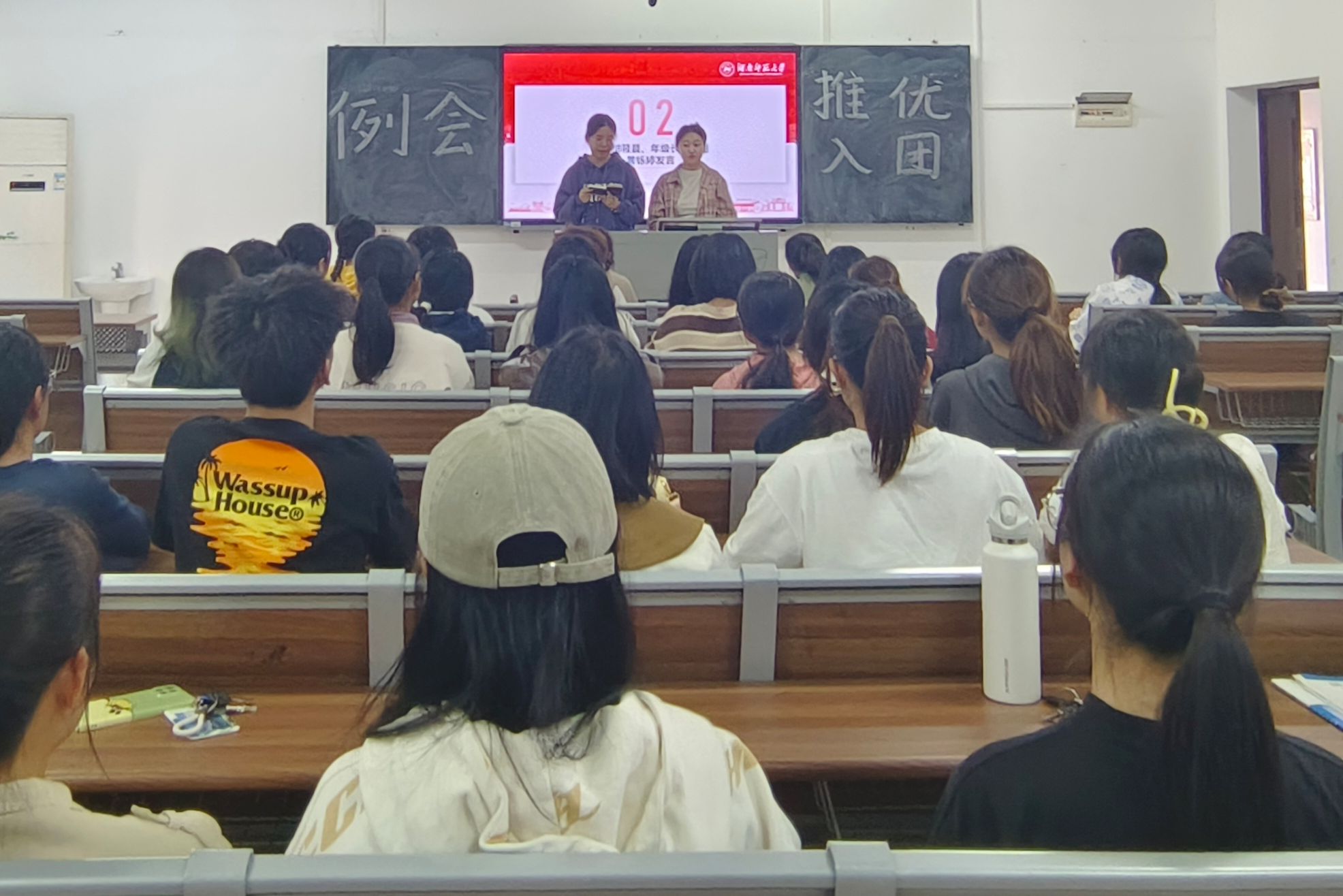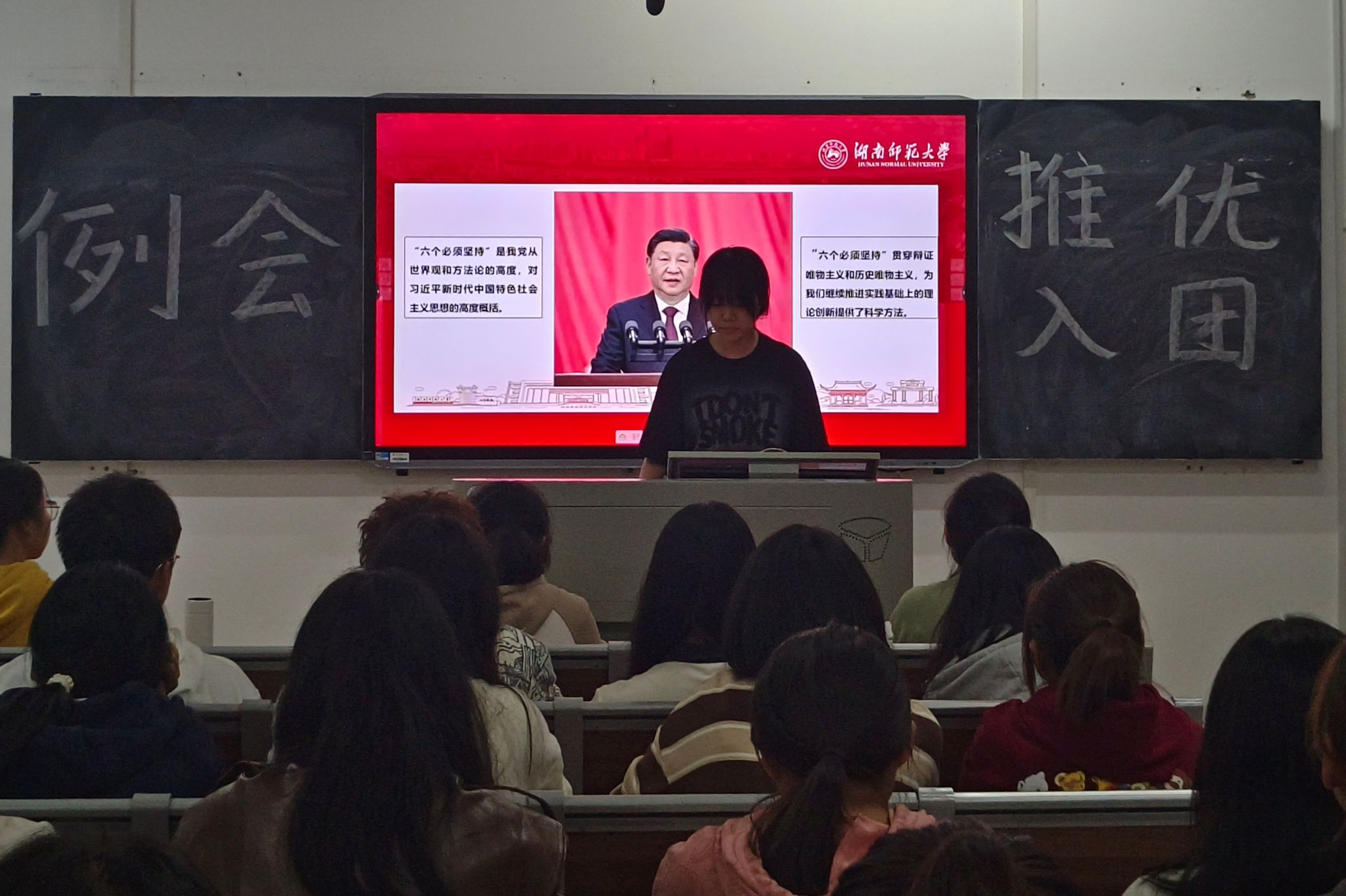 此次会议为团委招新后第一次例会,会议伊始,各部门部长带领部门成员依次进行自我介绍,并派出代表进行本部门的工作内容介绍和近期工作汇报。汇报完毕后,年级长兼团委学生副书记黄铄婷与团委学生副书记胡筱晨先后进行发言,对各部门的工作提出建议并对工作情况进行询问。发言完毕后,由组织部第二负责人邓欣悦带领全体成员学习贯彻习近平新时代中国特色社会主义思想主题教育团支部专题学习中的“专题1:思想旗帜”,其内容主要为学习习近平新时代中国特色社会主义思想的核心要义,重点围绕“两个结合”、“六个必须坚持”、“十个明确”、“十四个坚持”、“十三个方面成就”开展学习。学习完毕后,韦婷宣布“推优入团”活动开始,九位候选人依次上台发表讲话,讲述他们对进入团校学习的目的和决心。此后进行线上投票,根据投票结果,进入团校学习的成员依次为刘甜果、黄嘉懿、黄思琪、聂颉矞、向珍梅。