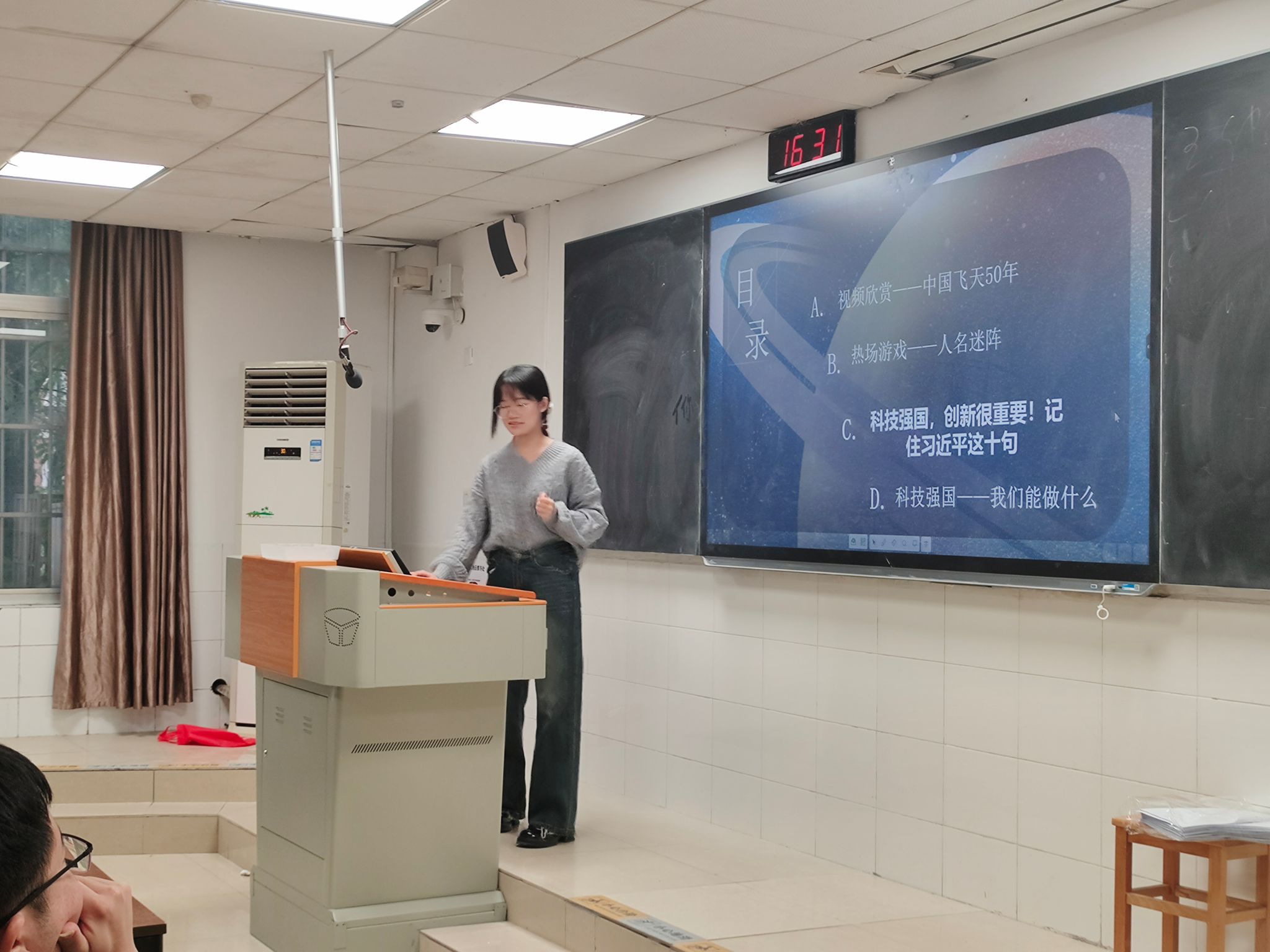 盖欣然就“科技创新与科技强国”的主题,引用习近平主席对“科技强国,创新很重要!”的指示,结合专业特色,围绕科技强国的概念与科技创新我们怎么做展开交流。盖欣然积极创新活动形式,选取相关视频“中国飞天50年”进行观赏,开展趣味游戏,加深了同学们对科技强国的理解与感悟。