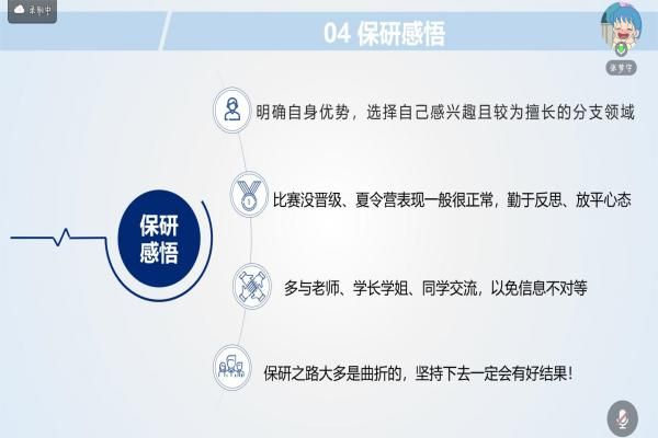 活动进行中,张梦宇学姐从个人介绍、保研途径、论文竞赛分享、保研感悟四个方面出发,较为系统地阐述了关于保研的相关流程以及注意事项。接着,刘海艳学姐重点介绍保研推免成功的一些经验。同时,同学们积极踊跃地提出自己的疑问,包括关于专业、院校等方面,学姐们热情地回答了同学们的问题,同学们收获颇丰。