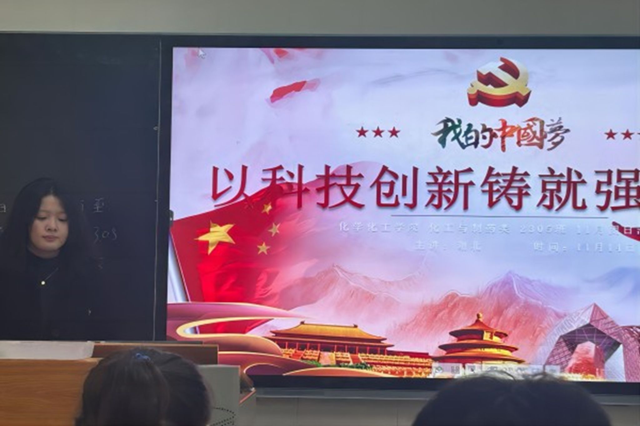 谢北通过图片分享了新时代四大发明成果,展现21世纪科技便利生活的场景,强调新时代科技创新的重要性,从国家、企业和个人三个层面分析如何实现科技强国。班长方磊从化工与制药专业出发,分析科技强国与化工专业学生理想之间的关系,号召全体成员将个人理想与国家科技强国需求结合起来,用专业知识助推强国梦的实现。谢北组织全体成员对习近平新时代中国特色社会主义思想强国复兴篇章进行学习,明确中国式现代化特征、目标、战略安排和重要原则,号召全体成员牢记习近平总书记对青少年的嘱托与期望,投身科技创新与科技强国,助力国家强国复兴之梦的实现。