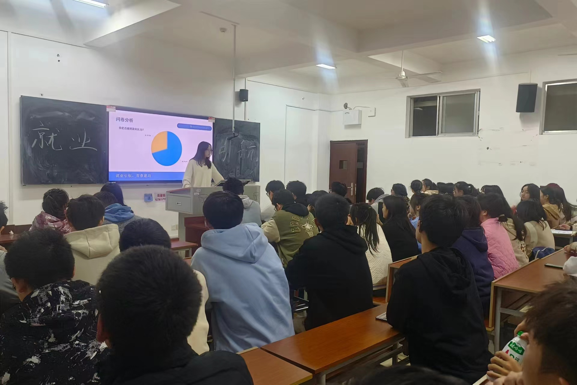 此次活动正式开始前,贺婷利用班级官方君对此次团日活动进行宣传,并且通过调察问卷提前了解同学们职业规划、技能掌握、就业准备以及行业认知等相关情况以便有针对性地开展此次团日活动。此外,此次活动特别邀请了有经验的在校学长学姐来到现场,向同学们介绍就业条件和市场需求,分享就业方面的一些基本技巧和就业指导,传递行业信息和发展趋势以及考研保研等相关信息。此次活动还邀请了已经参加工作的学姐进行线上交流,解决了同学们心中的困惑,为同学们未来的就业之路提供全面的保障。