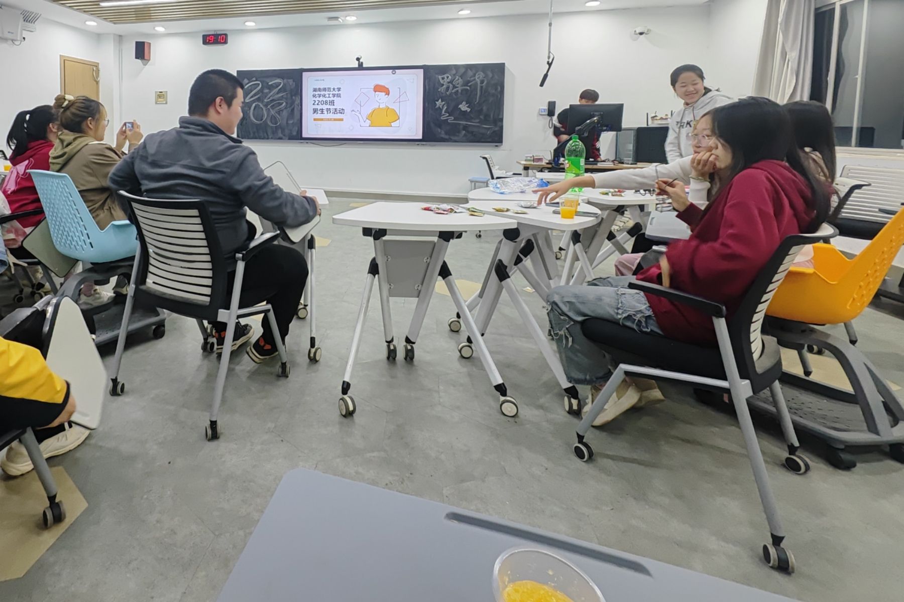 活动开始前,班长吴晰睿精心准备男生节的节日礼物和团建活动项目,并利用海报和班级官方QQ进行活动宣传。活动开始,男生代表任天阔发言表达对女生们的感谢。吴晰睿分发零食和水果,大家享受着美食并纷纷聚在一起开始了纸牌游戏、击鼓传花、你画我猜等各式各样的活动。活动期间,氛围融洽,全体同学在欢声笑语中度过了一个难忘的晚上。