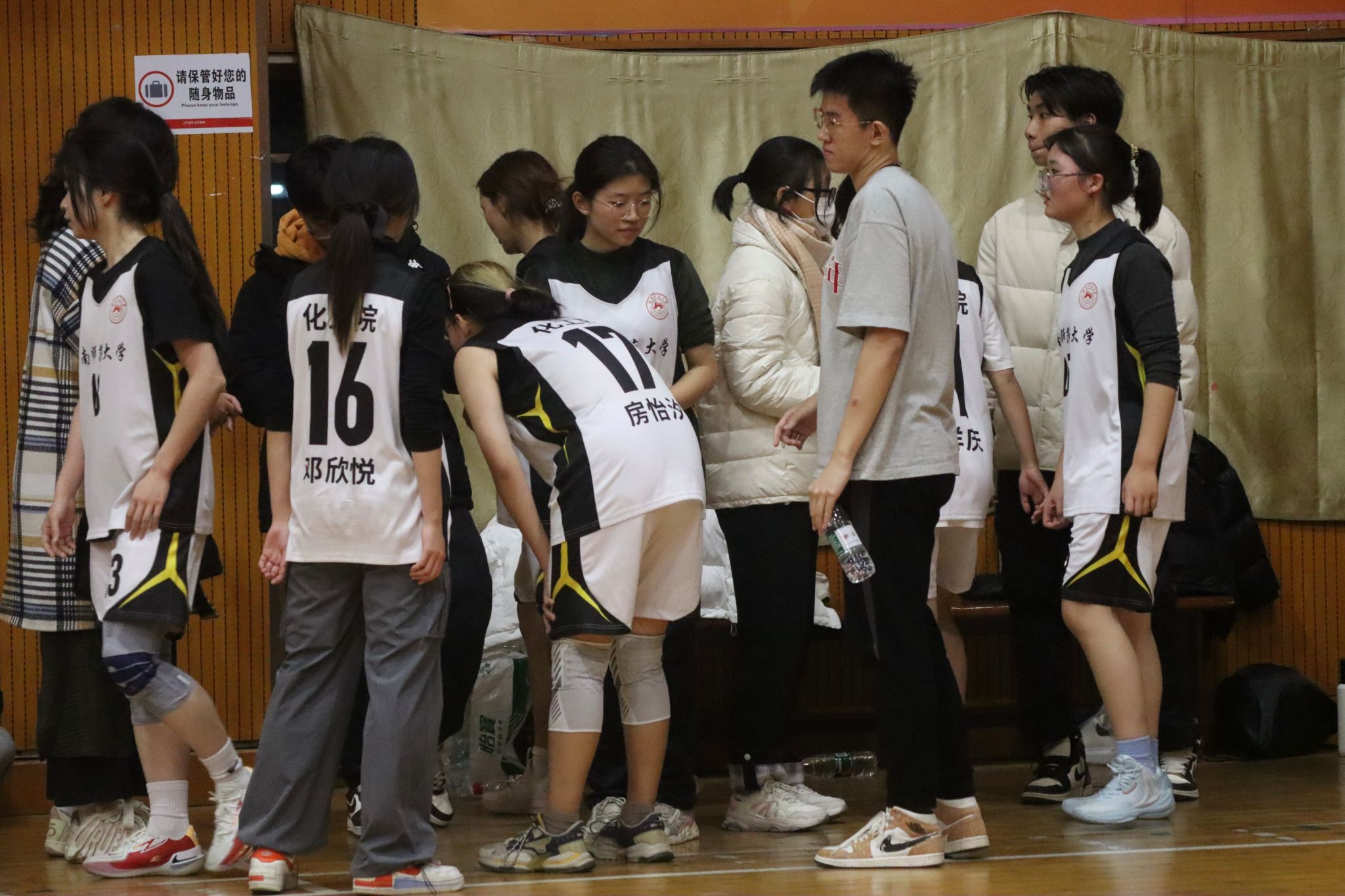化工院请求暂停,球员于场下喝水休息、商讨战术