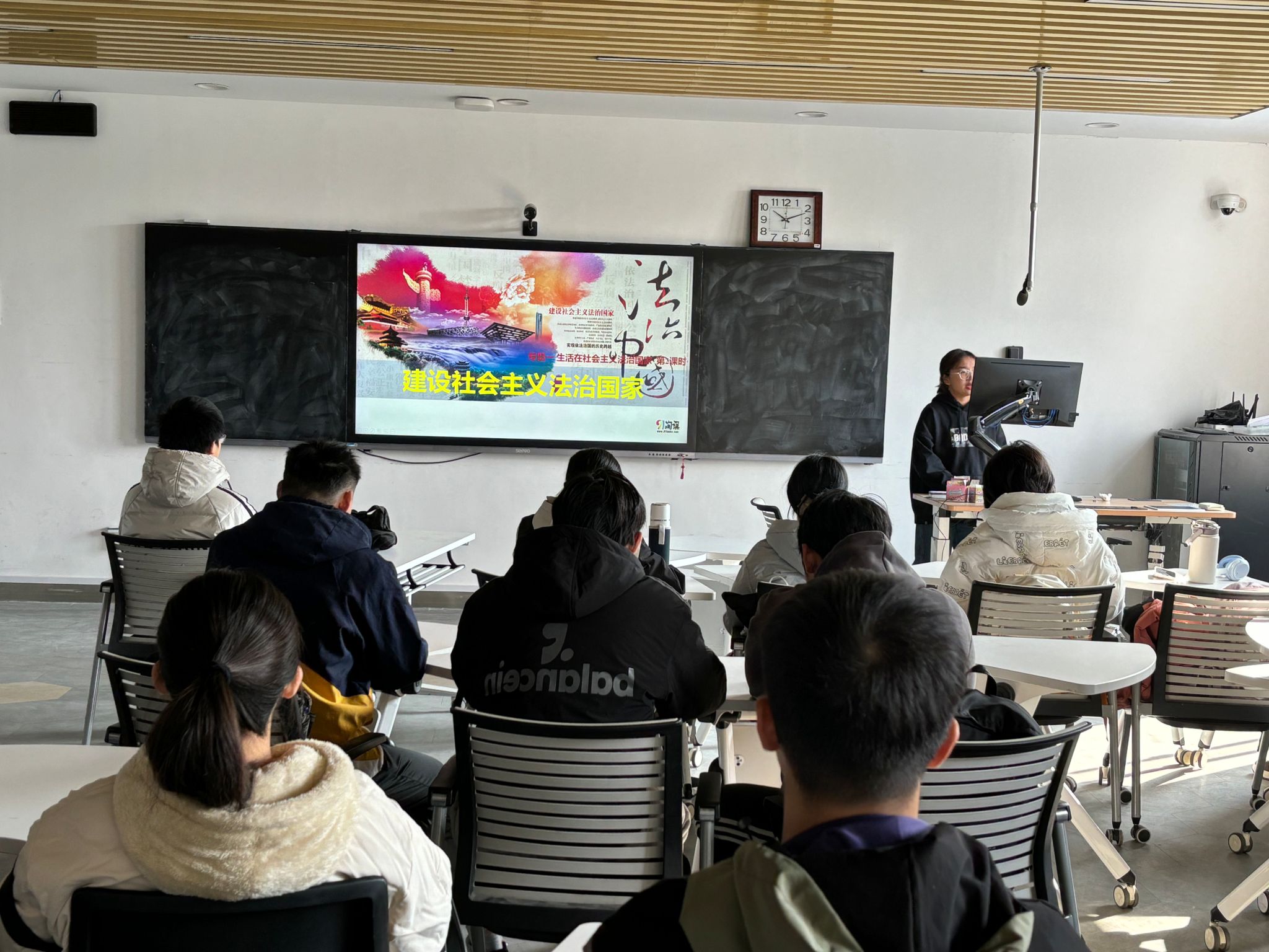 在活动中,团支书周玥霖从宪法的的历史和背景、宪法的体系和结构、宪法的原则和价值观、宪法的内容和规定这四个方面带领大家了解学习宪法。在活动的最后,团支书周玥霖带领大家传唱《宪法伴我们成长》歌曲,一起宣读宪法基本内容。同学们在活动过后相互分享对于学习宪法的感悟。
