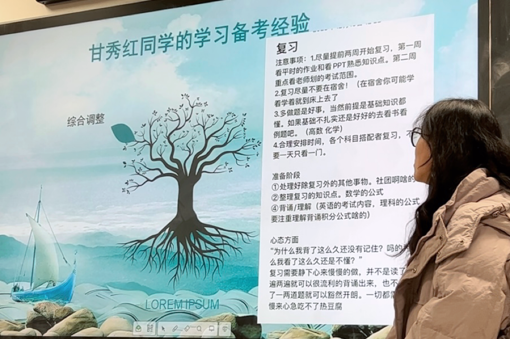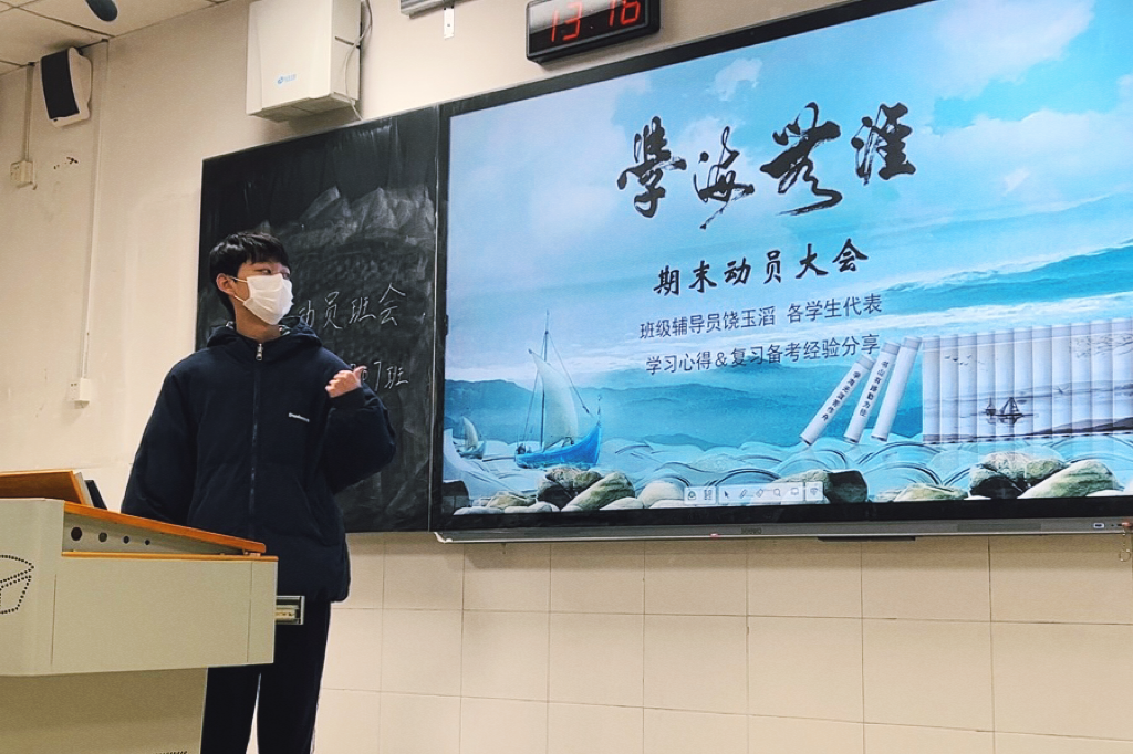 班会开展前期,夏通负责班会的动员准备,选出了优秀学生代表进行期末复习方法及备考经验的分享。会上,周俊杰、甘秀红、王霄扬等9名同学就自己的学习心得体会及备考经验作了分享。班会最后,由饶玉滔做总结,他强调同学们复习要多关注老师课件上的内容以及要劳逸结合,保持良好的心态。