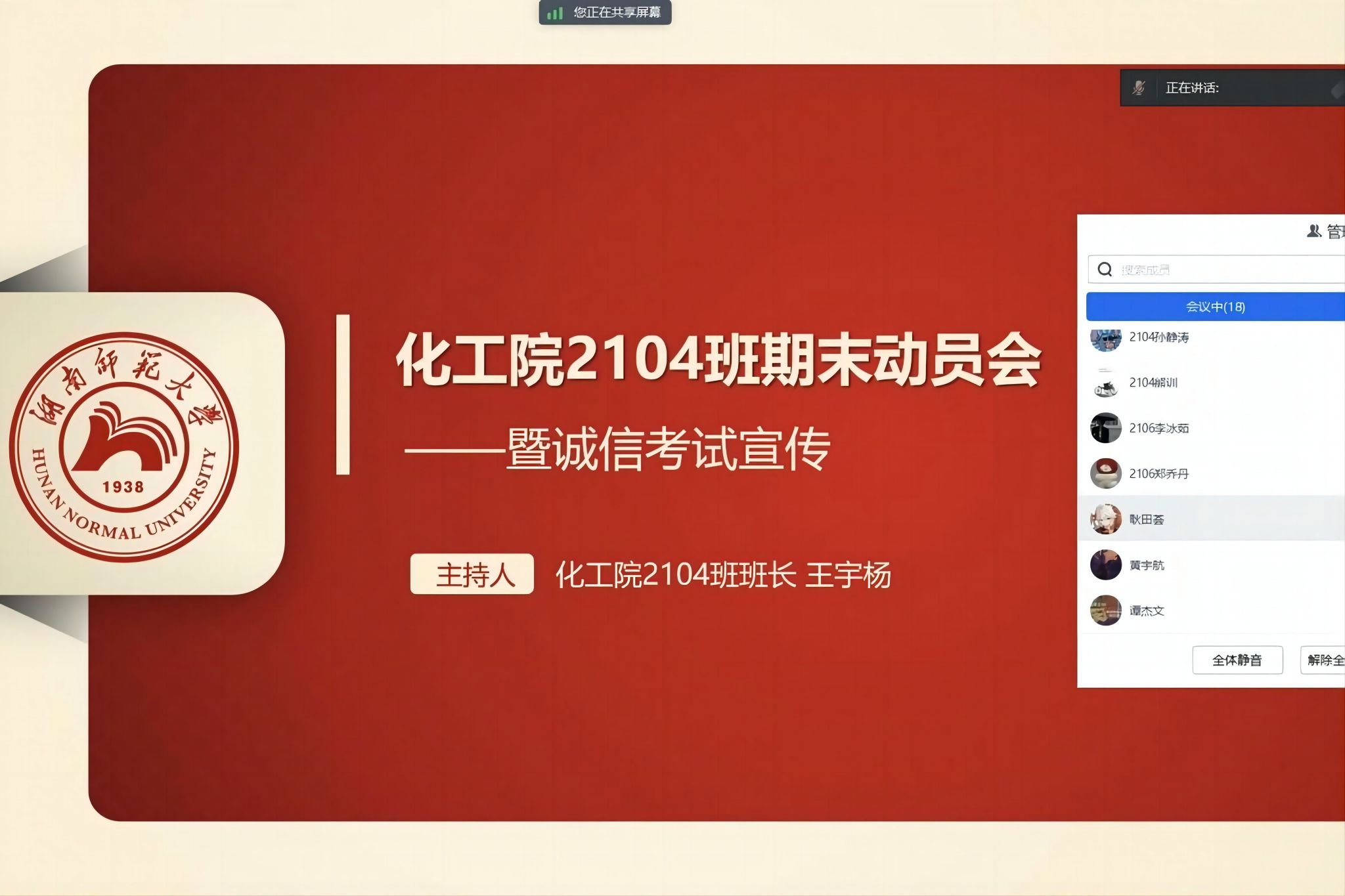 (通讯员 王宇杨)12月20日19时30分,英国365集团2104班全体同学通过线上会议方式开展了2023-2024学年上学期期末考试动员班会暨诚信考试宣传会议,此次会议由班长王宇杨主持。
