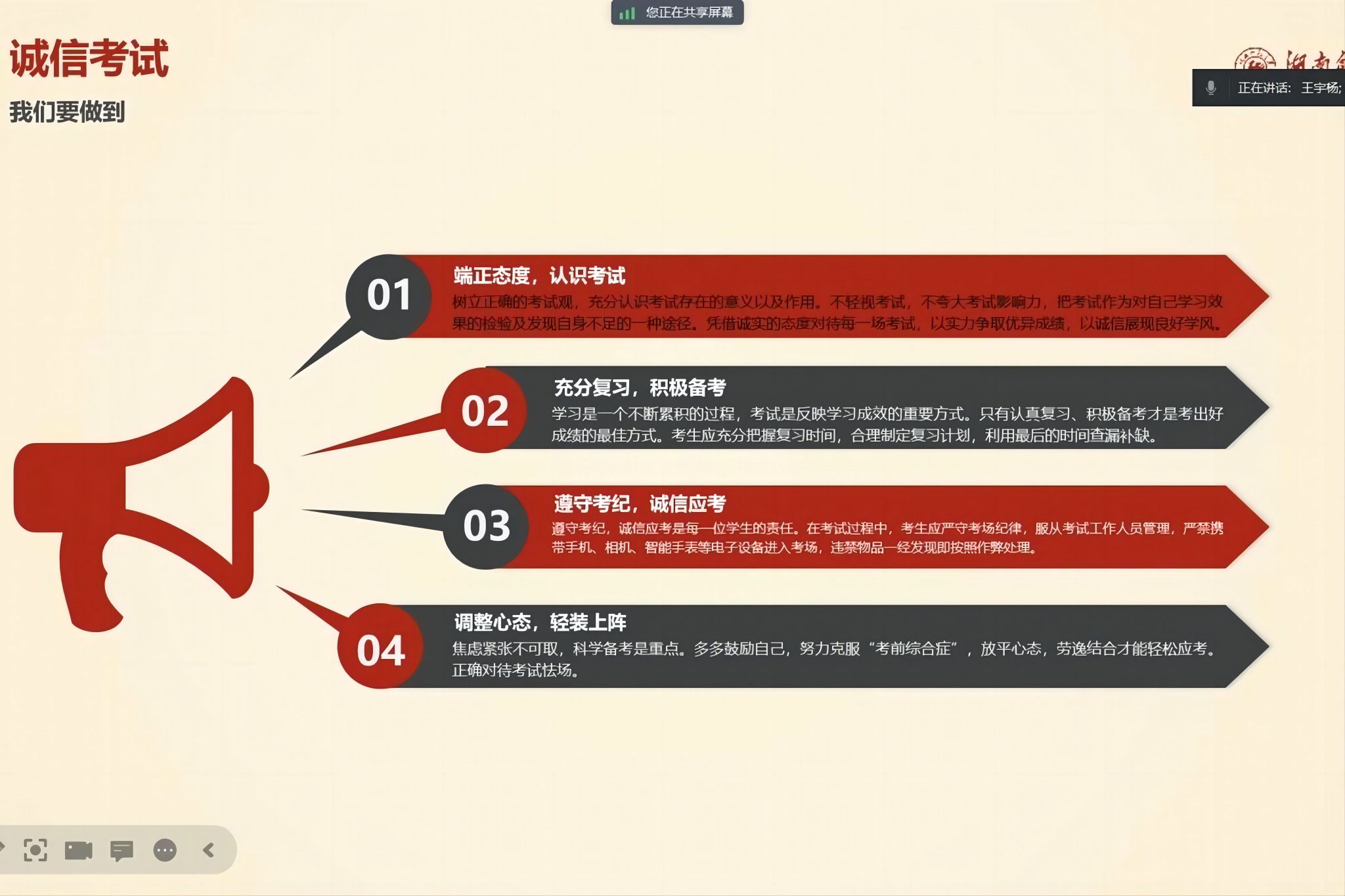 会议开始后,王宇杨详细介绍了期末考试的安排,包括考试时间、地点、科目和注意事项,并提醒学生们在考试前做好充分的准备。会中,王宇杨强调了诚信考试的重要性,呼吁同学们自觉遵守考试纪律,不要作弊。通过分享诚信考试的相关宣传材料,同学们更加深入地理解了诚信考试的意义和要求。会议还邀请谭杰文和李冰茹两位同学分享了他们的复习方法。他们强调了制定复习计划、注重课堂听讲、及时复习、多做练习等的重要性。他们的经验分享让同学们受益匪浅。