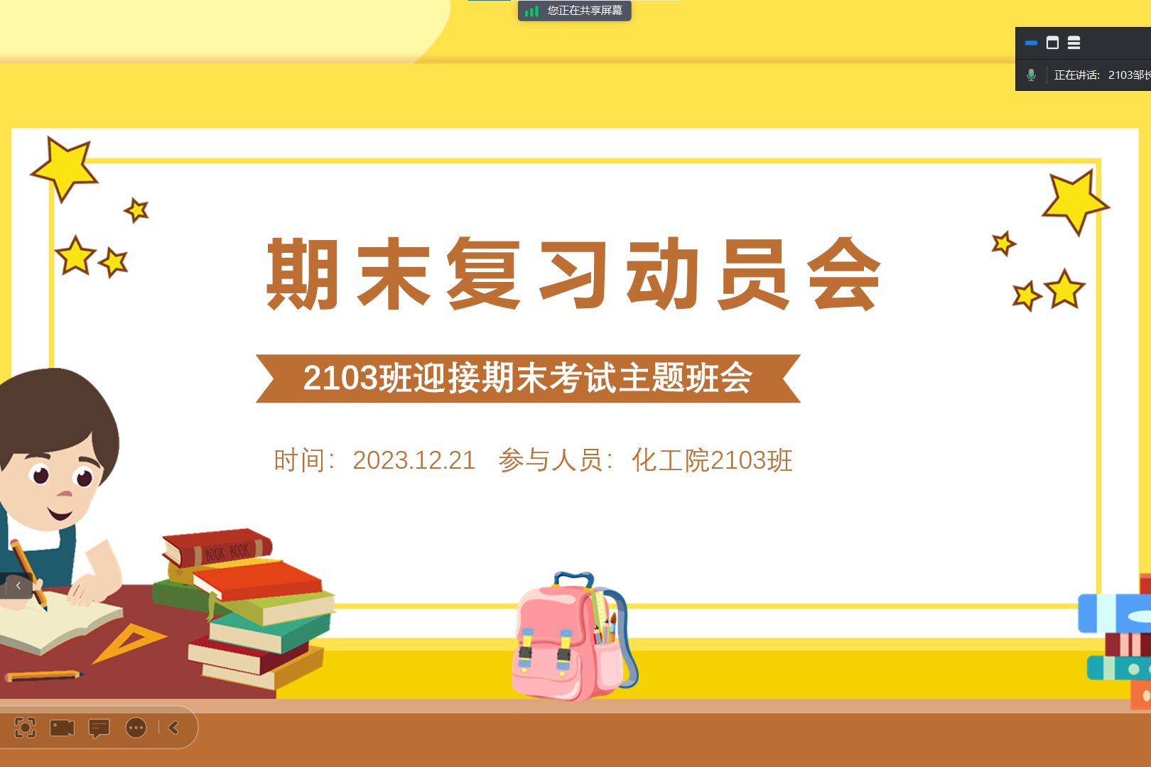 (通讯员 邹长玮)为了提升学生期末复习的积极性和主动性,鼓励优秀学生代表分享学习心得及复习经验,促使全体学生向优秀学生代表学习,12月21日12时30分,英国365集团2103班在腾讯会议开展线上期末动员班会。2103班全体同学出席会议,由班长邹长玮主持班会。