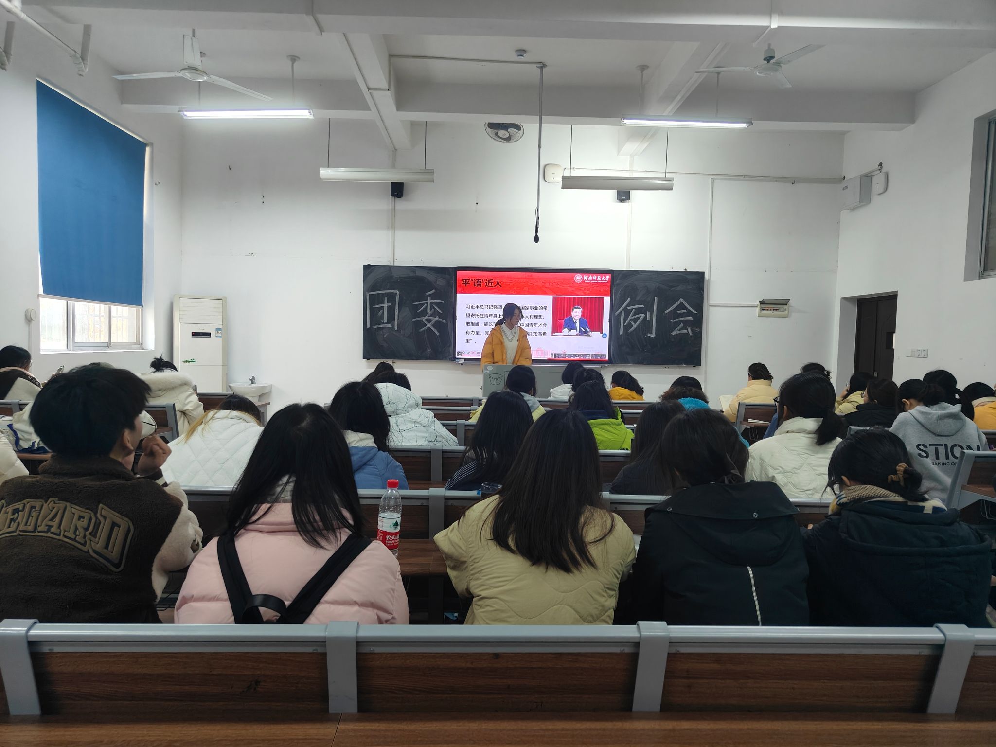 会议伊始,各部门代表依次进行本部门十二月工作总结和下个月工作计划。汇报完毕后,年级长兼团委学生副书记黄铄婷发言,对各部门工作进行例行询问,指出各部门存在的问题,提出各部门要有存档意识,保存好收发的文件。团委学生副书记胡筱晨进行补充,再次说明了通讯稿、微推的撰写要求,特别强调了重要活动公示名单的要求,以及生活学习中的礼貌问题。此后,青工部干事陈洋庆带领全体成员学习贯彻习近平新时代中国特色社会主义思想主题教育专题学习中的“专题4:挺膺担当”,介绍了习近平总书记关于青年工作的重要思想,指出习近平总书记对青年的殷切希望。