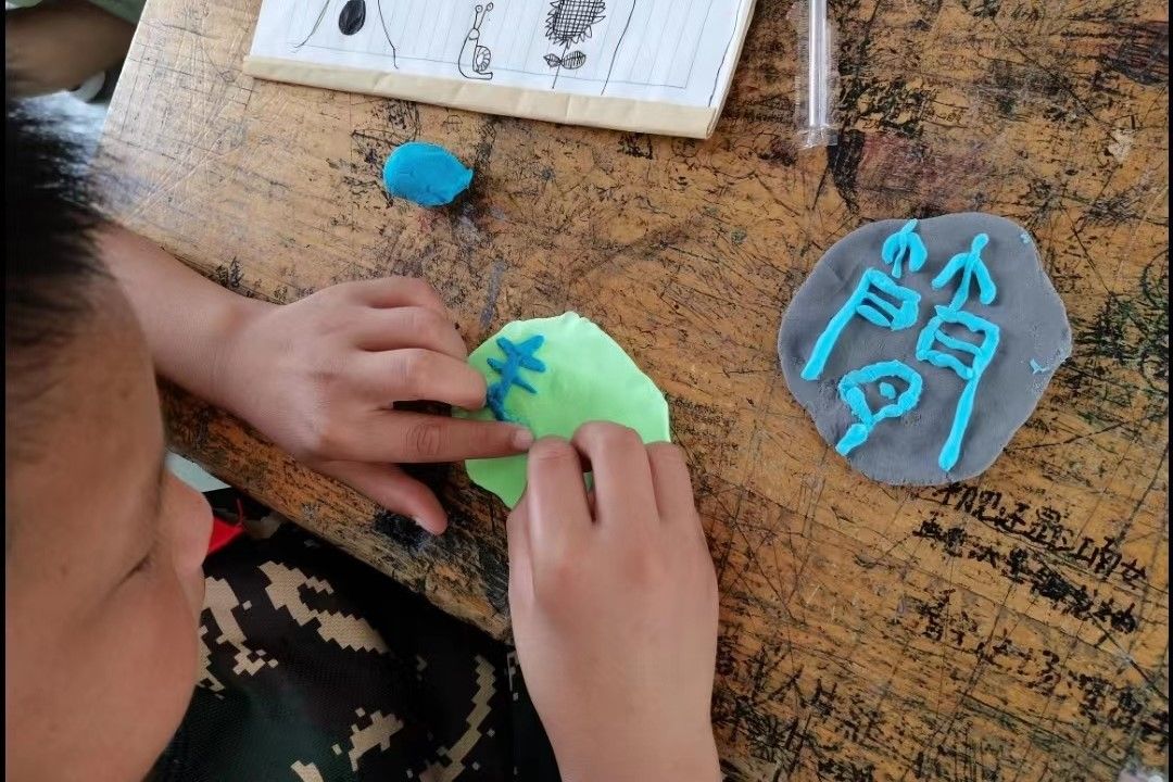 书法课上,任课老师赵小曼先向同学们播放了一段视频。通过这段视频,同学们了解了我国自古代以来汉字的演变过程。视频播放结束后,老师向同学们展示百家姓的篆体书写,让同学们通过图片寻找自己的姓氏并在纸上书写。随后老师向大家分发黏土材料,让同学们利用黏土复刻自己姓氏的篆体。