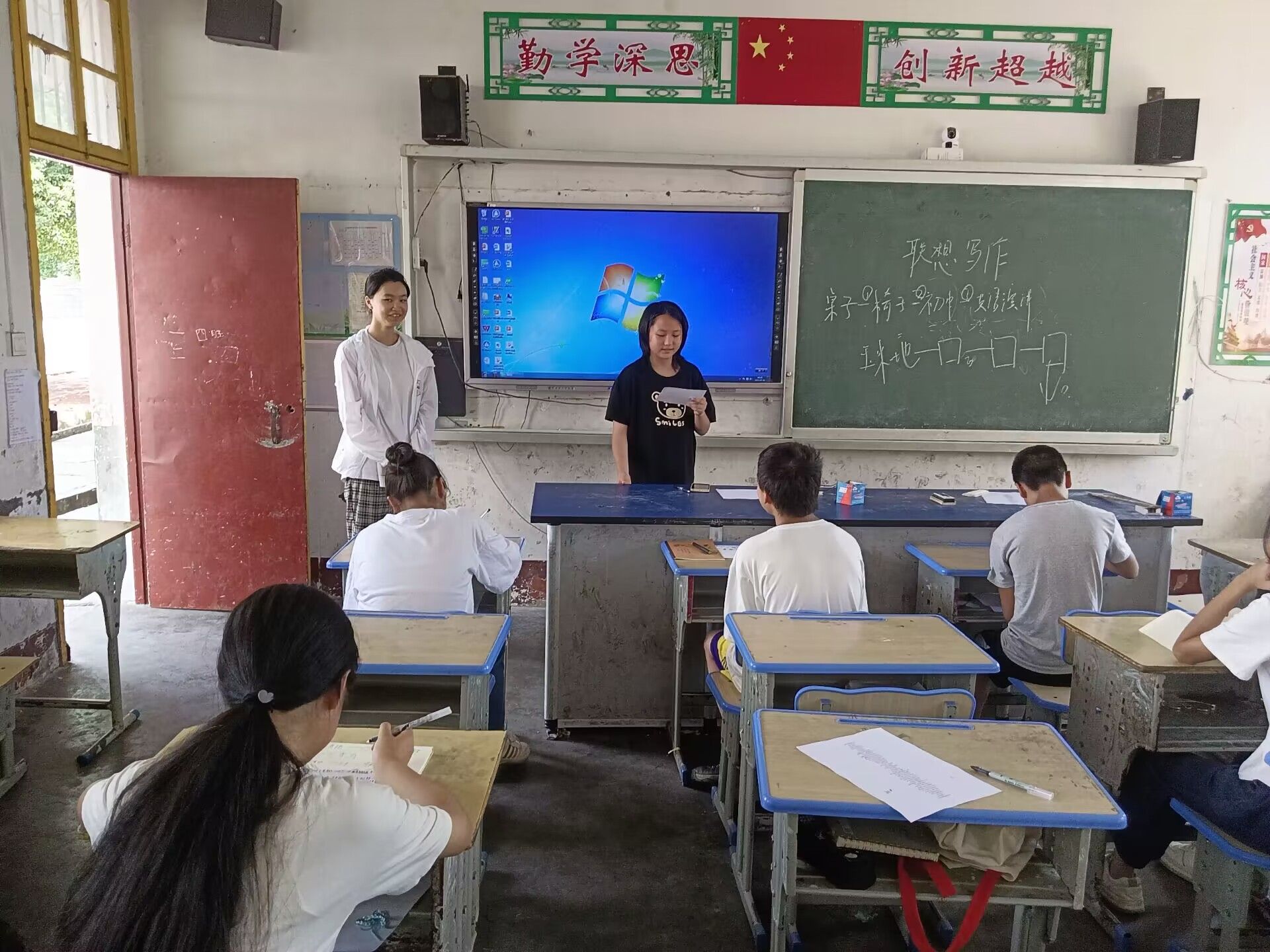 趣味语文课上,教学组队员易胡曼以联想写作为主题,通过丰富多彩的教学内容,让乡村学生们感受到了语文的魅力和乐趣。在课堂上,易胡曼运用生动的语言和形象的实例,引导学生们发挥自己的联想和创造力,尝试着从不同的角度看待问题,从而激发他们的写作灵感。