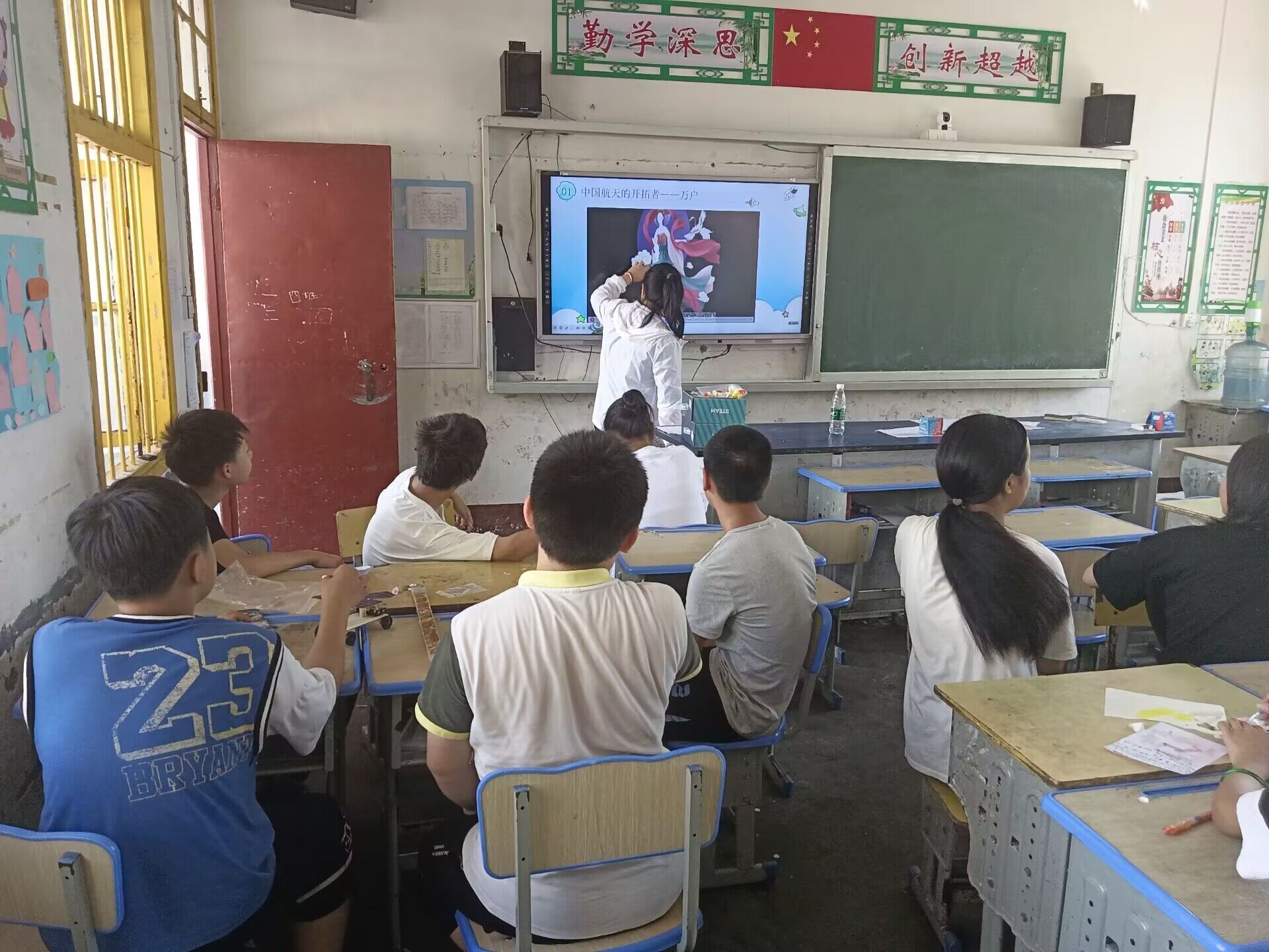 开展趣味音乐课与科普制作的初中教学班的同学较为拘谨,因此胡青玲、孟思帆、邓超群以及调研组队员舒军航都积极参与到课堂中来,以此调动学生们的积极性。