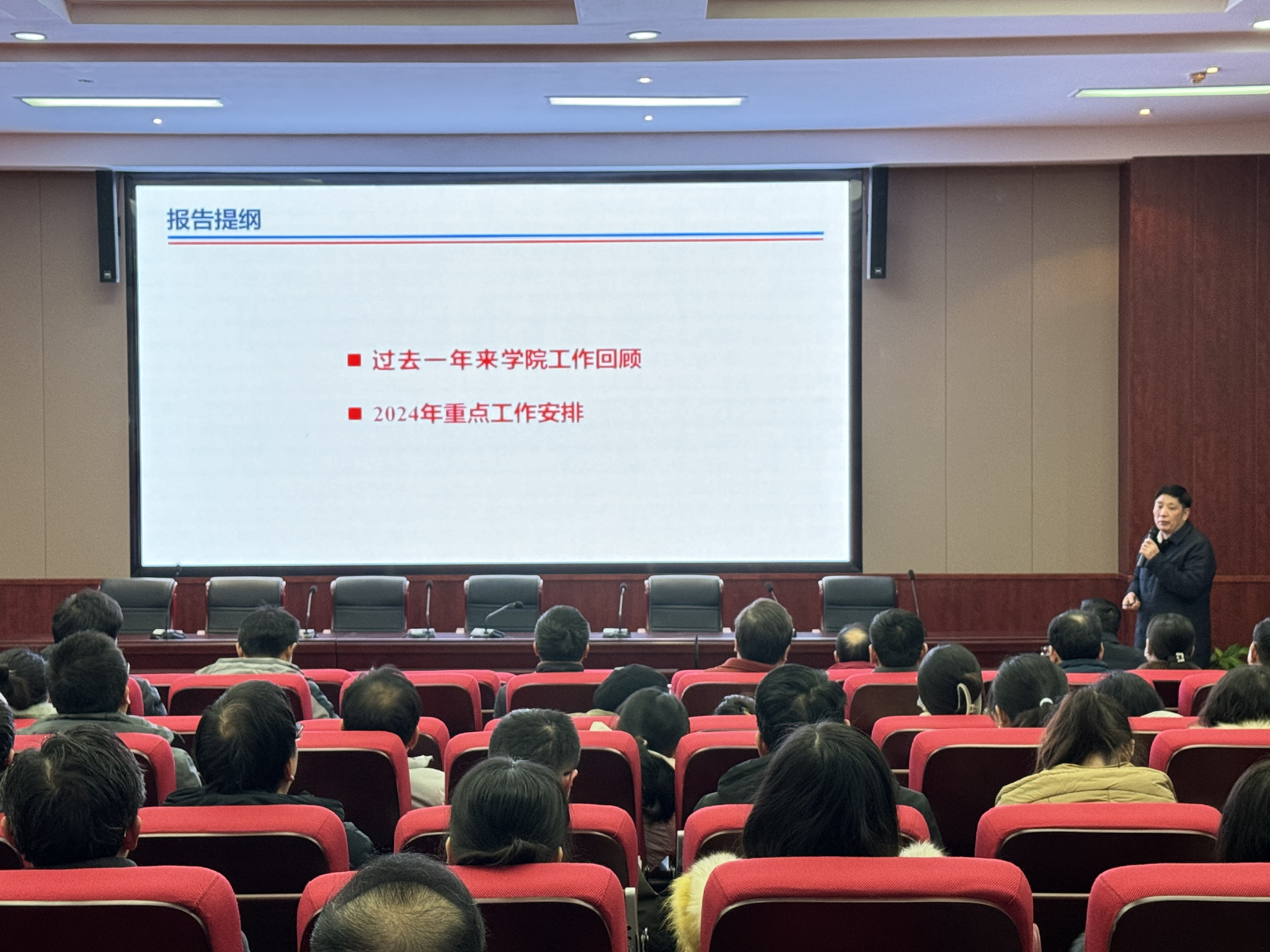 杨荣华作2023年学院工作报告。他表示,回顾过去一年来的工作,在校党委行政的正确领导下,全院教职员工共同努力,提高教学、科研水平和管理能力,不断改善办学条件,学院各项工作取得新进展。同时从党建工作、人才培养、科学研究等方面对2024年的主要工作提出了具体要求。