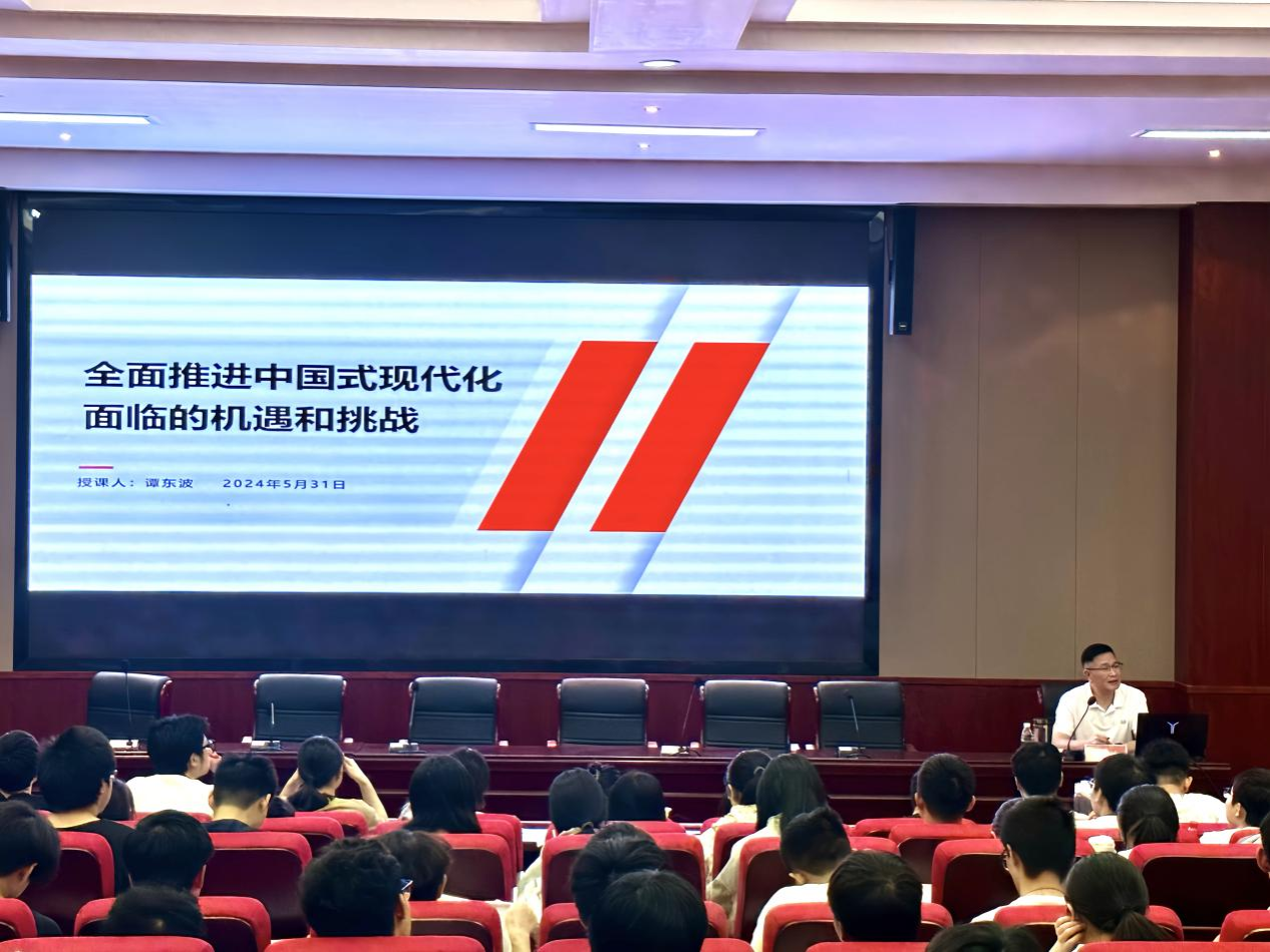 (通讯员 许佳慧 张晓晨)5月31日晚,学院党委书记谭东波以“全面推进中国式现代化面临的机遇和挑战”为题,为2023级本科生讲授形势与政策课。讲座由学生辅导员唐健清主持。