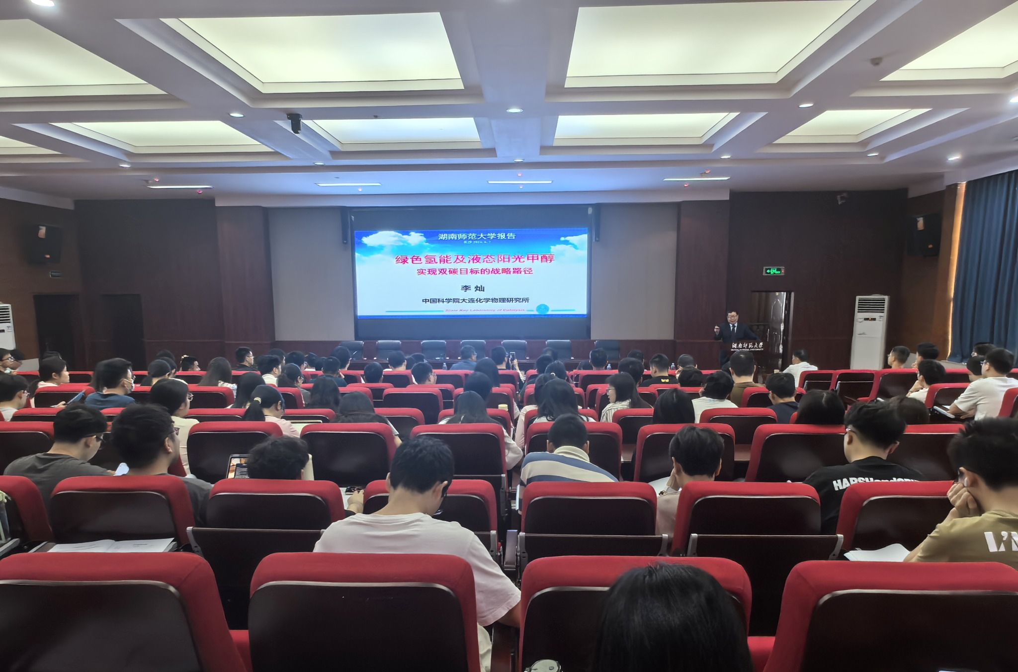 李灿院士指出绿色氢能和液态阳光甲醇是实现双碳目标的战略路径,详细阐述了光催化分解水制氢过程中需要攻克的太阳光吸收、电荷分离、催化反应等三个学科领域内的难题,介绍了合成液态阳光甲醇的技术路线,展望了太阳光催化分解水制氢和人工光合成液态甲醇等的应用前景。提问环节,与会师生踊跃提问,李灿深入浅出地解答了问题,并勉励师生未来共同携手探索绿色能源发展的无限可能。