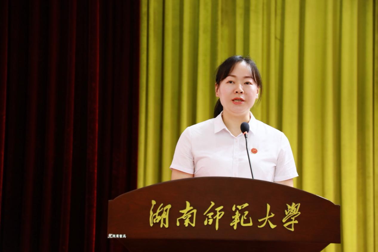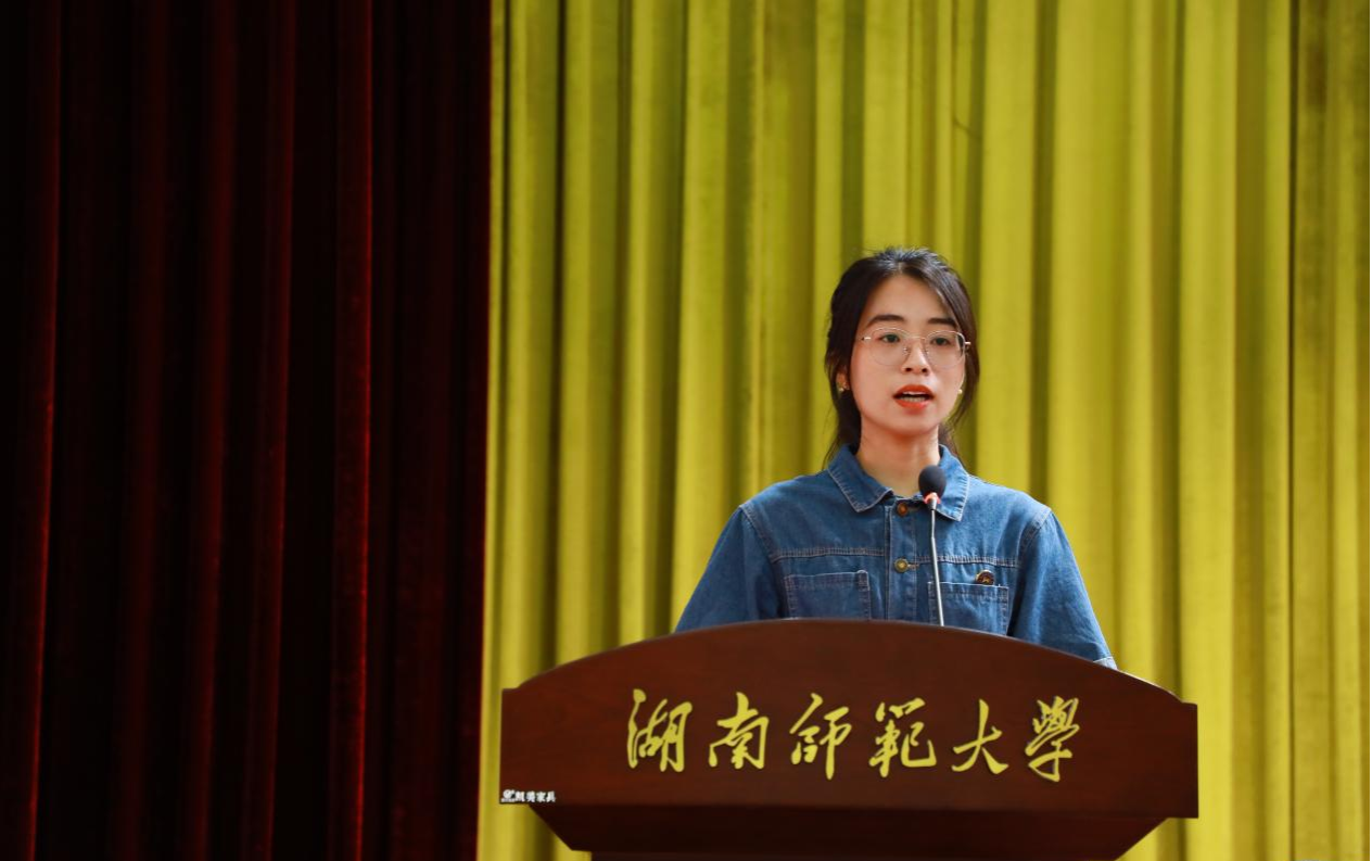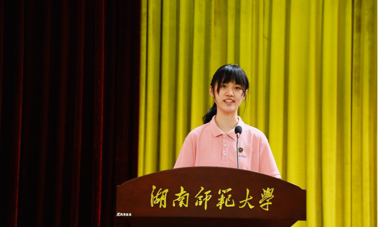 2023级化学专业博士研究生曾星宇同学代表老生发言。她将自己在学院八年求学时光的感悟分享给全体新同学。她勉励大家培养全面素质和实现个性成长、保持对世界的热爱和好奇、勇敢地探索自己的兴趣和潜能,不负韶华,奋发有为。