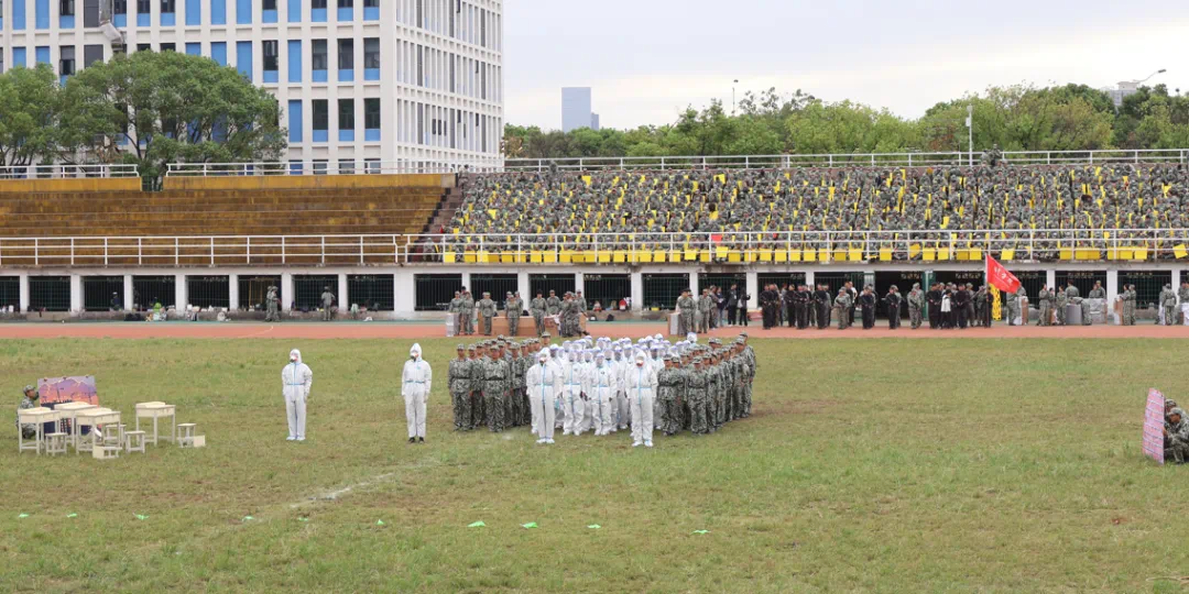 大会在庄严的国歌声中拉开序幕,全体师生齐唱国歌。随着分列式进行曲响起,标兵就位,化院学子精神抖擞、目光坚定,迈着整齐的步伐,喊着嘹亮的口号踏正步走过主席台前接受检阅,获得领导们一致好评。分列式检阅完成后进行特色汇报表演,我院新生与其他6个学院的新生共同组成翻花方阵,以手中翻腾之花,献礼新中国成立75周年。接着,生化防护演练开始进行,我院参演同学分工明确,配合得当,作业规范,顺利完成了演练的各项任务。