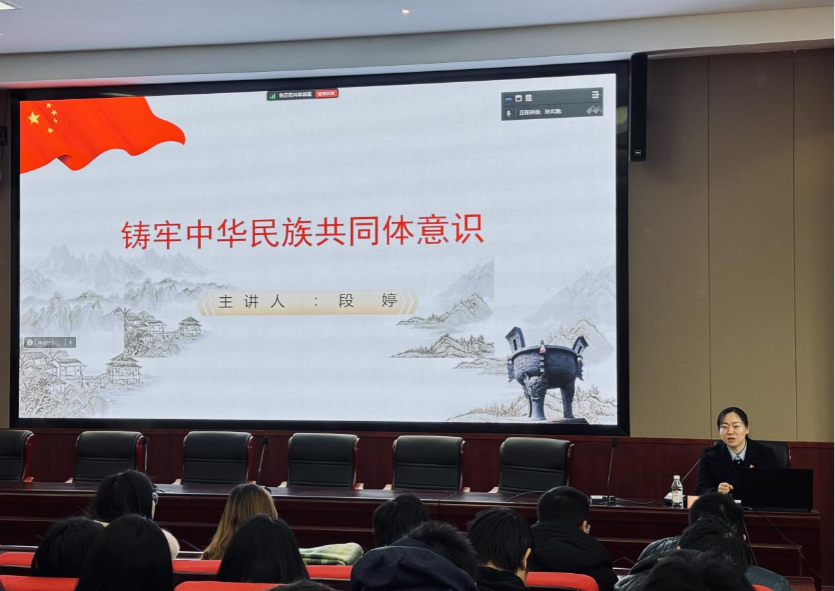 (通讯员 邱晶晶 曾媛)12月19日上午,学院党委副书记段婷以“铸牢中华民族共同体意识”为主题,为2024级本科生讲授形势与政策课程。本次课程由2024级辅导员孙文涛主持。