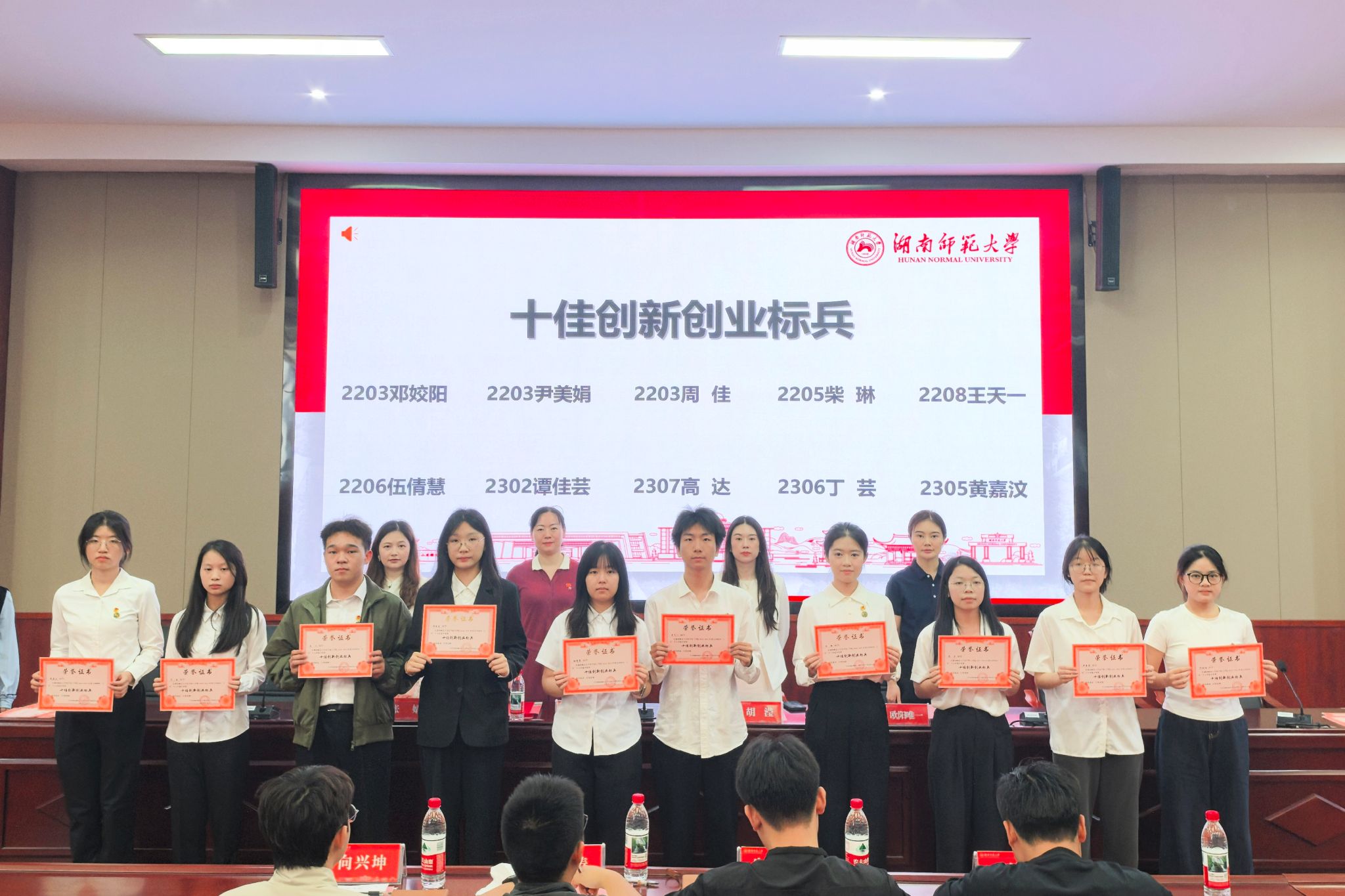大会第一阶段举行团内五四表彰大会。国歌奏响后,胡滢致辞。她对荣获表彰的集体和个人致以热烈祝贺,并以习总书记给西部计划志愿者的回信为切入点,鼓励青年一代学习五四精神,坚定理想信念,厚植家国情怀,练就过硬本领,发扬奋斗精神,为中国式现代化建设贡献青春力量。张婧宣读《关于表彰2024-2025年度英国365集团五四团内先进集体和优秀个人的决定》。胡滢、段婷、欧阳唯一、张婧为获奖同学颁奖,并合影留念。