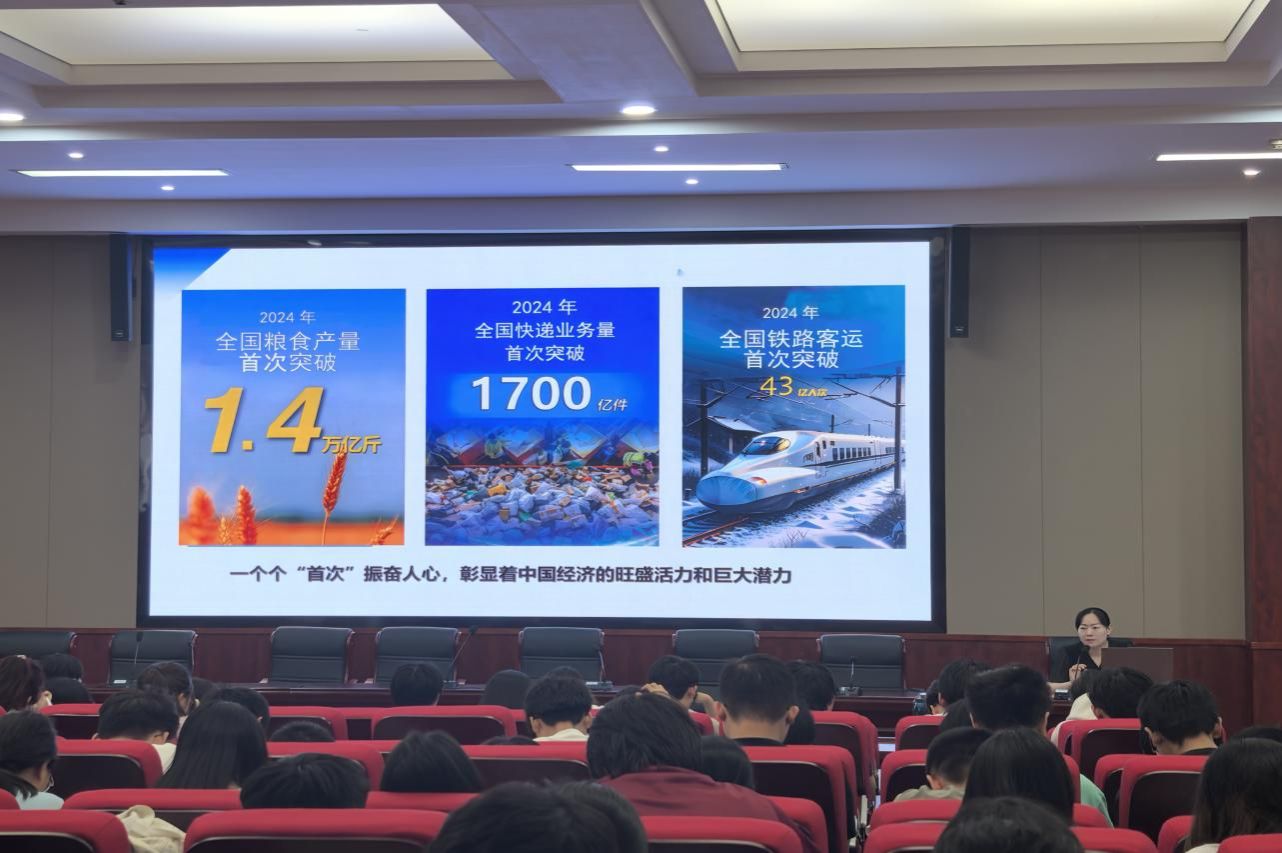 她围绕政府工作报告,从“发展信心从哪来”、“迎难而上靠什么”、“奋发有为怎么干”三方面展开系统性讲解。她指出我国经济已由高速增长阶段转向高质量发展阶段,近年来的经济回升向好;深入分析了当前我国经济面临的诸多挑战,以及经济长期向好的基本趋势不会改变的原因。她强调:当前中国经济正处于转型升级的关键阶段,就业环境因结构性竞争加剧、企业用人门槛提高,部分行业岗位收缩明显等原因面临严峻挑战。国家高度重视就业工作,把就业定为最大的民生工程、民心工程、根基工程。她希望同学们站在时代的十字路口,切忌”眼高手低“,要夯实专业基础,提高综合素养,树立良好的就业择业观,将青春融入国家经济发展的大局,实现个人职业发展与经济高质量发展的同频共振。