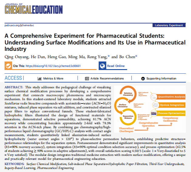 此次论文的发表,是学院教师陈波教授和杨蓉副教授第二次在该期刊发表教学改革类研究成果,进一步彰显了学院在推动科研反哺教学、提升本科教学质量方面的持续努力和显著成效,为国内外制药工程及相关专业的实验教学改革提供了有益的借鉴。其核心亮点主要体现在以下三个方面。一是创新技术与实践教学相结合。在该研究中,教师们创新性地将自主研发的“盐诱导相分离-疏水纸过滤”(Salt-Induced Phase Separation-Hydrophobic Paper Filtration, SIPS-HPF)技术成功应用于本科生的实验教学中,既丰富了实验教学内容,又体现了实验的先进性和挑战性,还为学生提供了实践机会。二是微观过程与可视教学相结合。在该研究中,教师团队将抽象的“表面改性”这一微观概念具体化、可视化,极大地增强了学生对相关原理的掌握和理解,帮助他们建立起宏观现象与微观结构之间的联系,有效突破了传统教学中对微观过程讲解的瓶颈。三是实验研究与应用教学相结合。在该研究中,学生以中药黄芩中活性成分黄芩素的提取、分离和富集为主线,独立自主完成与实际应用紧密结合的应用体验。