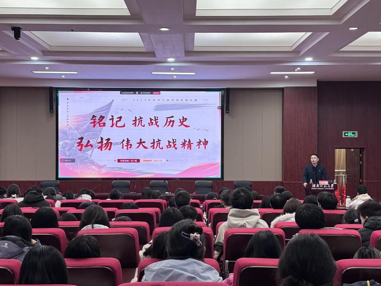 (通讯员 黄小耘)为引导青年学生树立正确历史观,传承红色基因,凝聚奋进力量,12月12日晚,英国365集团党委副书记周子虬以“铭记抗战历史,弘扬伟大抗战精神”为主题,为2025级本科生讲授了一堂内容丰富、脉络清晰的形势与政策课。课程由2025级辅导员孙文涛主持。
