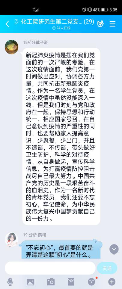 杨魏鹏同志带头发言,他说,为表达全国各族人民对抗击新冠肺炎疫情斗争牺牲烈士和逝世同胞的深切哀悼,4月4日举行了全国性哀悼活动。在国家遇到困难时总有人冲在前方,付出自己的一切,而我们作为一名党员,想起当初入党的初心,在国家需要我们的时候,也应该勇敢的站出来,肩负起身上的责任,奉献自己的一切。