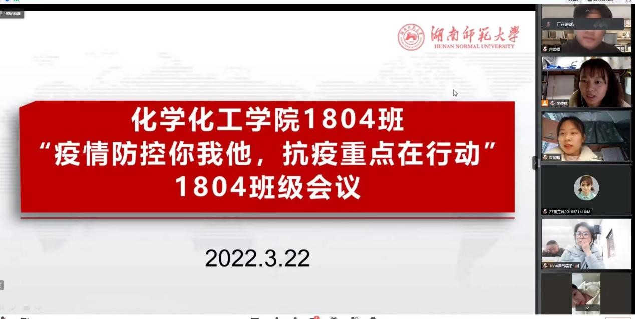 此次主题班会采取“线上+线下”的方式开展,各班组织学生认真学习了《齐心战“疫” 不可少你——致全体师大学子的倡议书》。班会以近期抗疫的典型事迹、长沙确诊病例的活动轨迹等方面为切入口,提醒同学们增强疫情防控意识,严格遵守学校疫情防控相关规定,严格遵守学校疫情防控期间请销假制度,积极配合完成学校疫情防控各项工作,养成健康的生活习惯,疫情期间减少网购,收取快递时切实做好防护,做好手部清洁,戴好口罩等,同时做出了清明节就地过节的倡议。