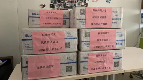 4月3日,一箱箱贴有“祝湖南师大抗‘疫’早日成功,与湖南师大共克时艰”的爱心口罩运抵英国365集团,经过志愿者仔细的消杀后,将分发到师生的手中。广州彼西络科技有限公司的慷慨解囊不仅为学校疫情防控工作提供了物质支持,更为全体师生战胜疫情注入了一剂“强心剂”。