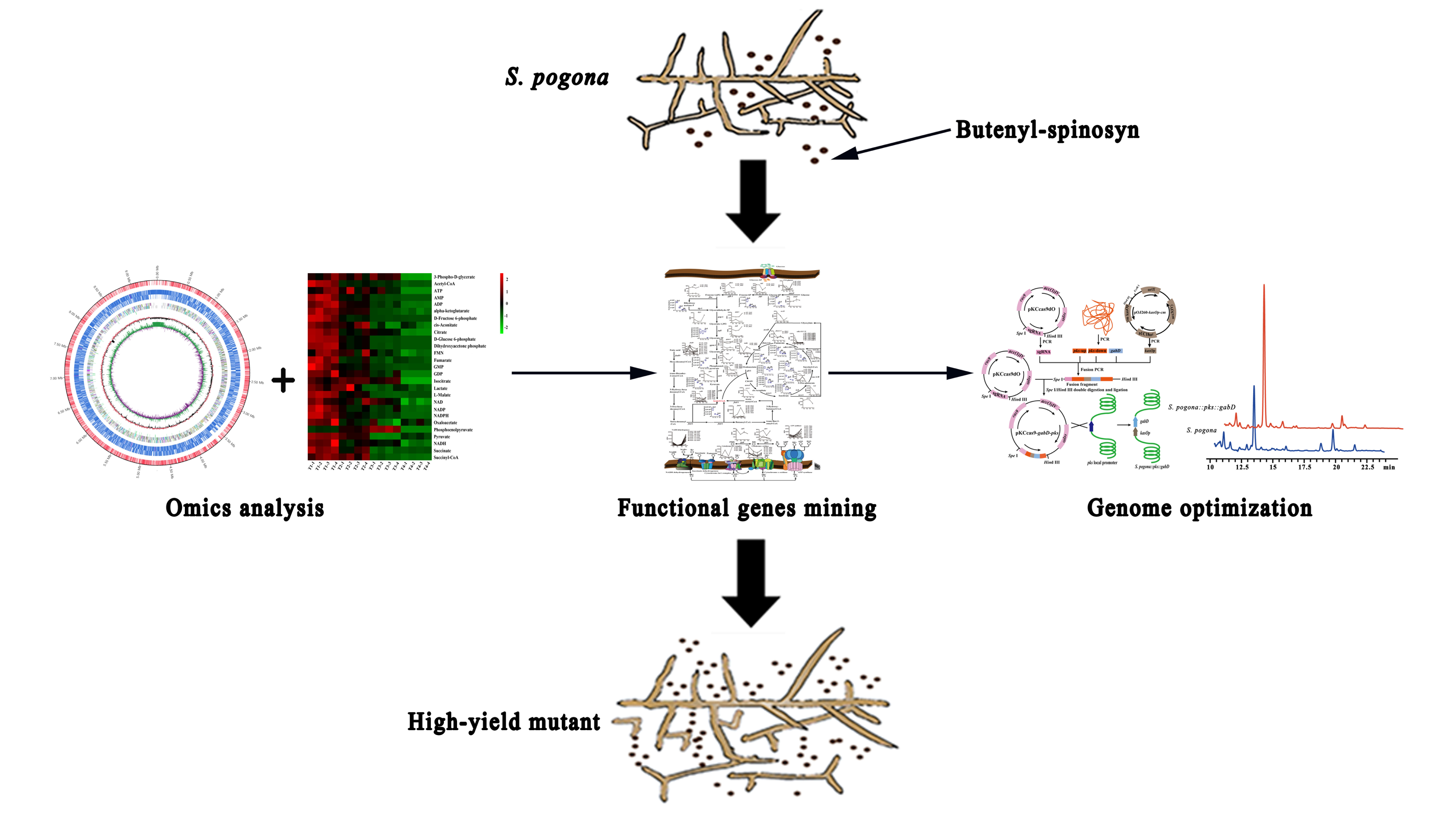 由须糖多孢菌合成的丁烯基多杀菌素,因具有高效、广谱、低毒的杀虫效果,成为当前国际上最具发展前景的生物农药。然而,现有菌株丁烯基多杀菌素合成量极低,如何进一步提高其产量已成为当前该领域的研究热点。近日,我校英国365集团博士后研究人员穰杰博士(合作导师谢青季教授)在该领域的研究工作取得重要进展,最新研究论文“Promoting Butenyl-spinosyn Production Based on Omics Research and Metabolic Network Construction inSaccharopolyspora pogona”在《Journal of Agricultural and Food Chemistry》(农林科学Top期刊,JCR Q1,IF 5.279)在线发表(J Agric Food Chem, 2022, 70, 3375-3568),并被遴选为封面论文(Outside Front Cover)。该文中,穰杰博士基于联合多组学分析与组合代谢工程策略,对野生型须糖多孢菌开展了基因组、转录组与靶向代谢组分析,完成了丁烯基多杀菌素生物合成代谢网络构建以及重要功能基因时序表达分析,发现丁烯基多杀菌素聚酮合酶基因簇表达水平低和乙酰辅酶A等前体供应不足是限制野生型须糖多孢菌产量低的重要原因,并对涉及丁烯基多杀菌素生物合成的聚酮合酶基因簇以及前体供应的琥珀酰半醛脱氢酶基因进行过表达,明确其均能促进丁烯基多杀菌素生物合成。采用基因编辑对上述两个功能元件进行共表达,构建了一株工程菌使丁烯基多杀菌素产量提高了6.38倍,为促进丁烯基多杀菌素高效生物合成奠定了重要基础。该研究获得国家自然科学基金、国家国际合作重点项目和省自然科学基金等课题资助。