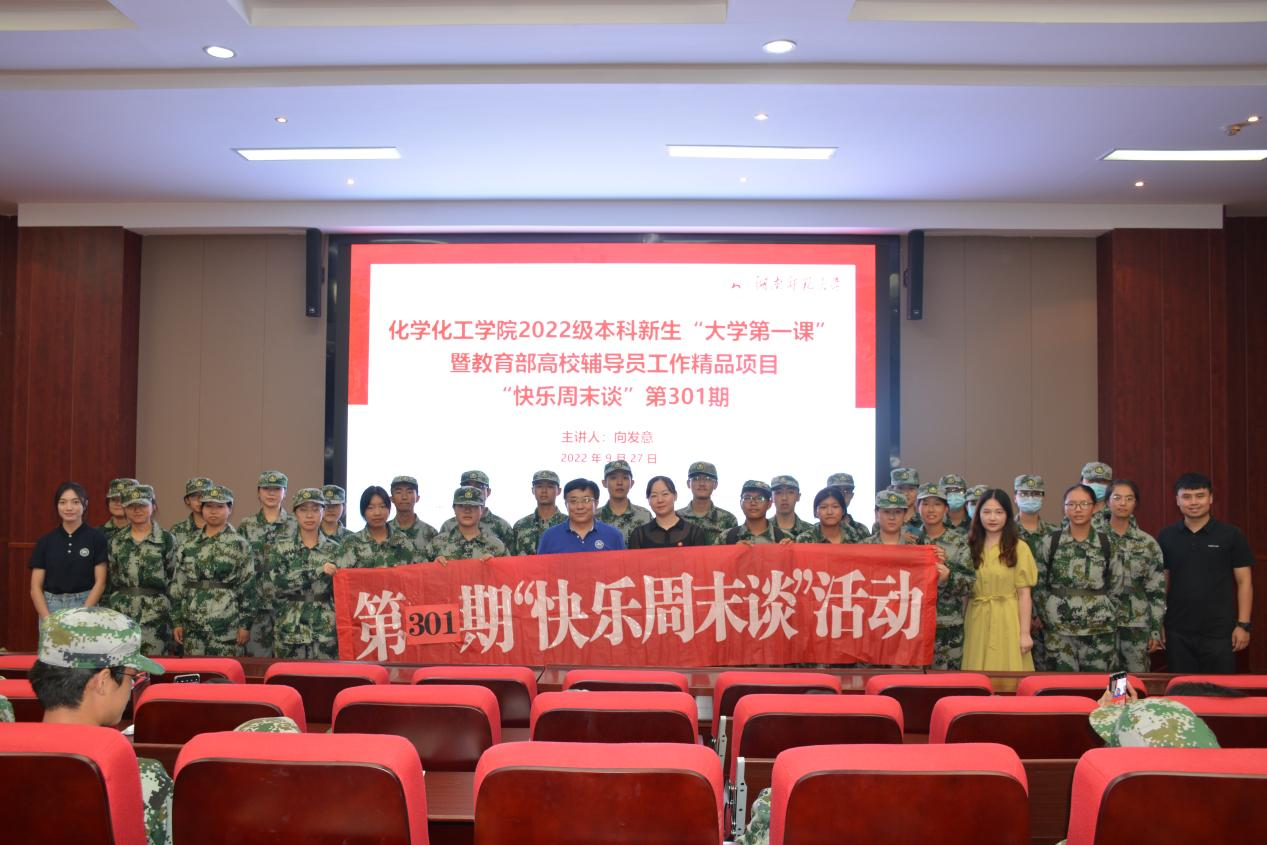 (通讯员 刘佳桐 奚芯蕊)9月27日下午,我院在化学楼达嘉维康报告厅举办2022级新生“大学第一课”暨教育部高校辅导员工作精品项目“快乐周末谈”第301期专题讲座。校学生工作部(处)部(处)长、武装部部长向发意受邀为我院学子讲授了题为《解读大学》的“大学第一课”,讲座由院党委副书记段婷主持。