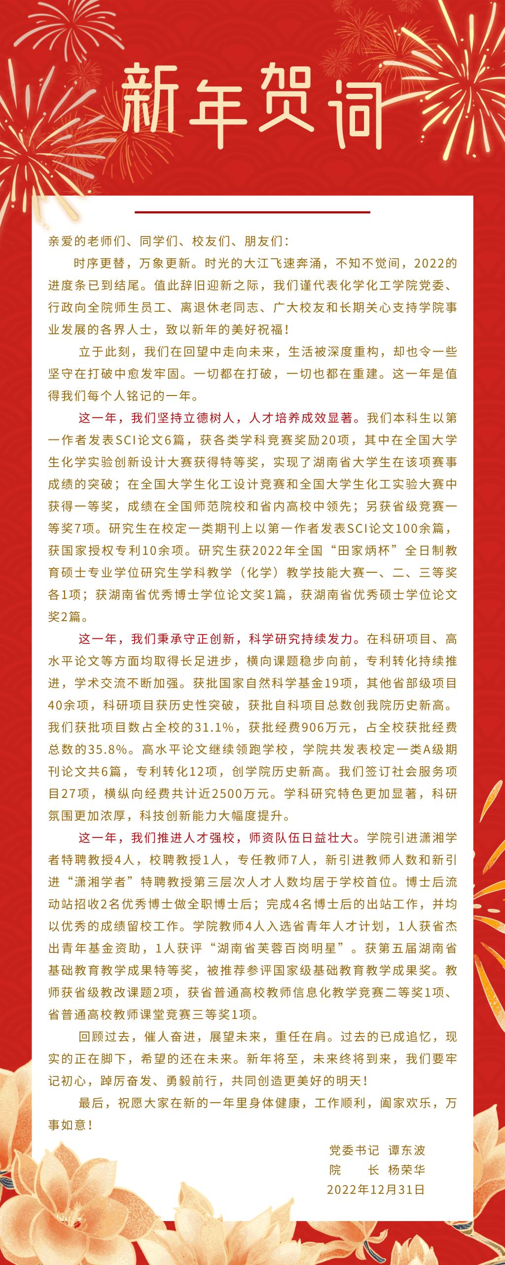 时序更替,万象更新。时光的大江飞速奔涌,不知不觉间,2022的进度条已到结尾。值此辞旧迎新之际,我们谨代表英国365集团党委、行政向全院师生员工、离退休老同志、广大校友和长期关心支持学院事业发展的各界人士,致以新年的美好祝福!