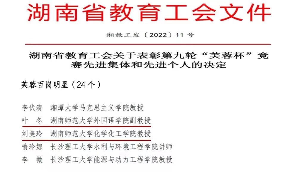 12月19日,湖南省总工会发布《关于全省第九轮女职工“芙蓉杯”竞赛总结评估情况的通报》,我院教师刘美玲教授荣获湖南省“芙蓉百岗明星”称号。