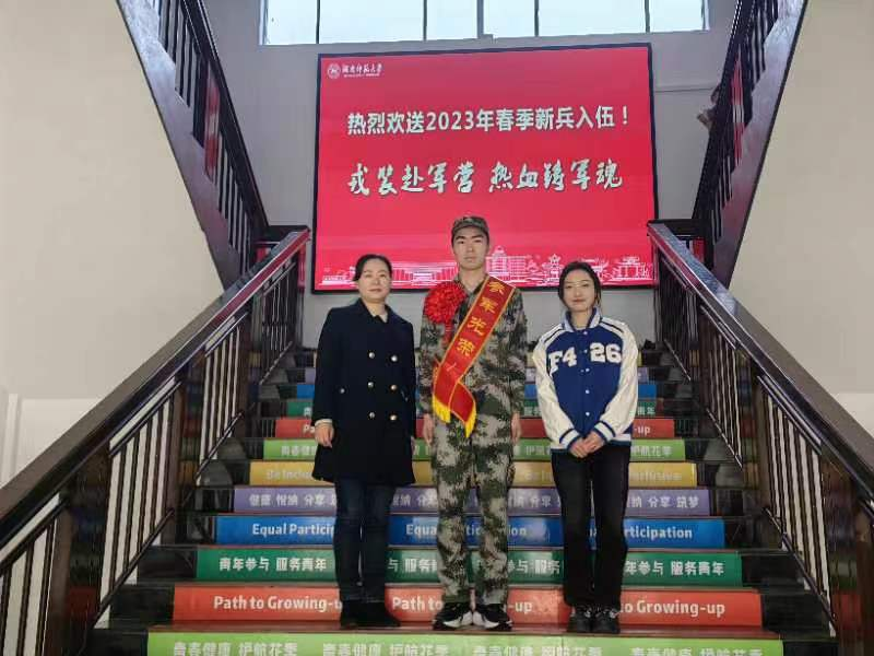 我院2022级化工与制药专业刘涵同学积极响应国家号召,在春季征兵活动中主动报名参军入伍。欢送仪式上,领导老师们为即将入伍的同学佩戴大红花和印有“参军光荣”的红色绶带,并赠予纪念品。段婷副书记代表学院对即将参军报国的刘涵表示祝贺和慰问,希望他能遵守纪律、认真服役、加强学习,争做“有灵魂,有血性,有本事,有品德”的“四有”军人,预祝他获取佳绩,成为学院和家人心中的骄傲。