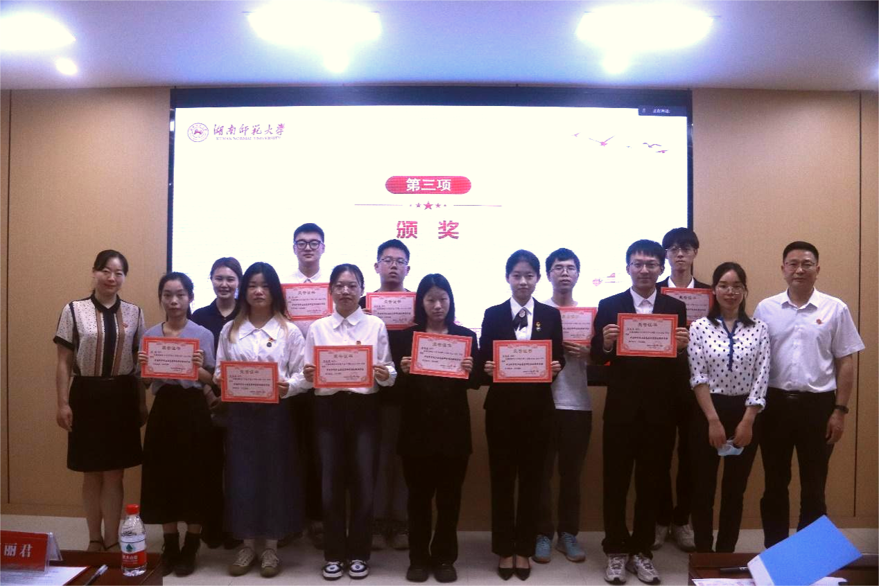仪式上,肖丽君宣读表彰名单,与谭东波、段婷一同为获奖学生颁发奖状。