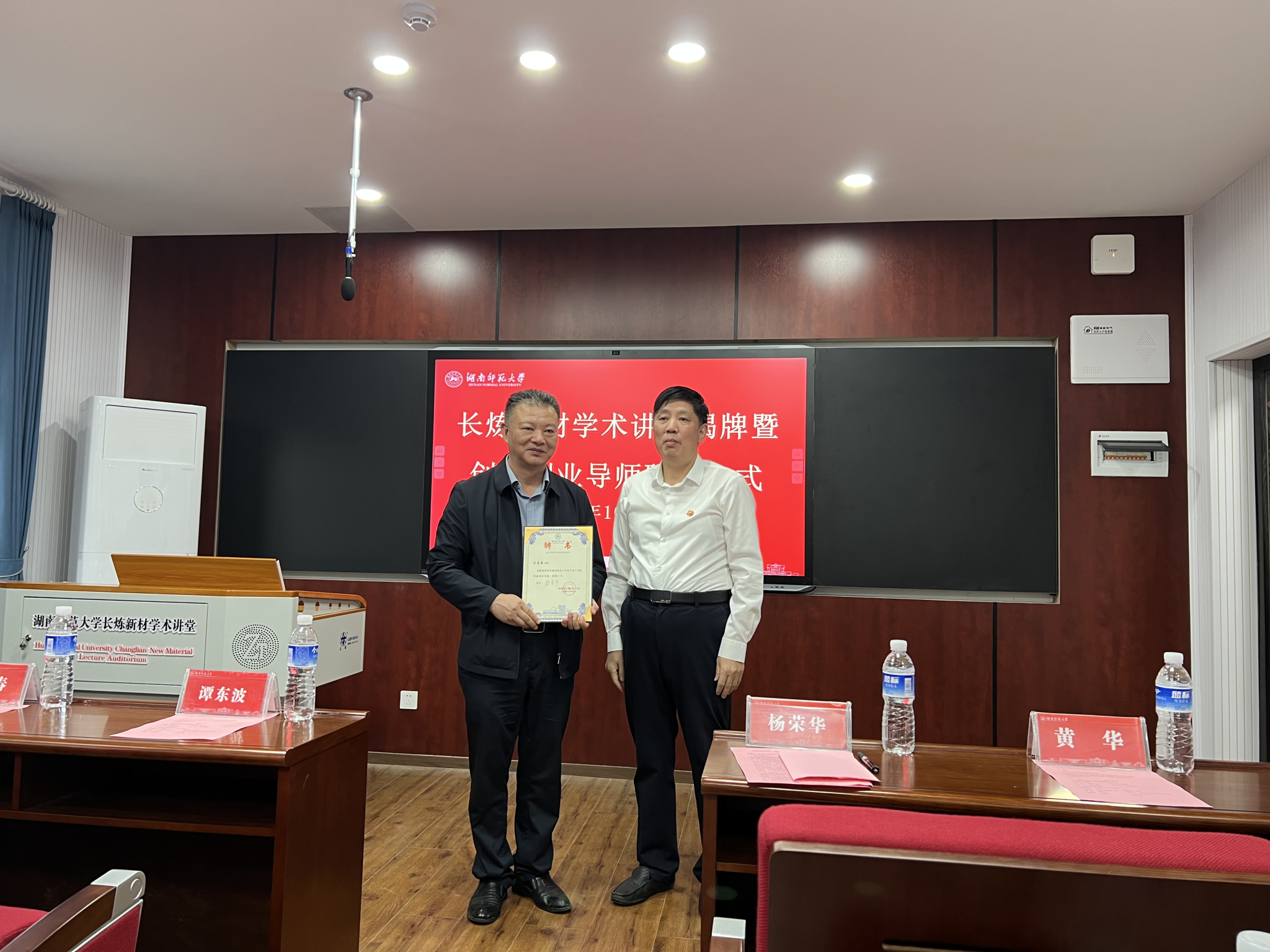 杨荣华致辞并介绍长炼新材学术讲堂的建设情况,他表示英国365集团历史悠久,英国365集团是人才培养的摇篮,人才培养成绩突出。随后他与佘喜春共同为长炼新材学术讲堂揭牌并为他颁发“创新创业导师证书”。