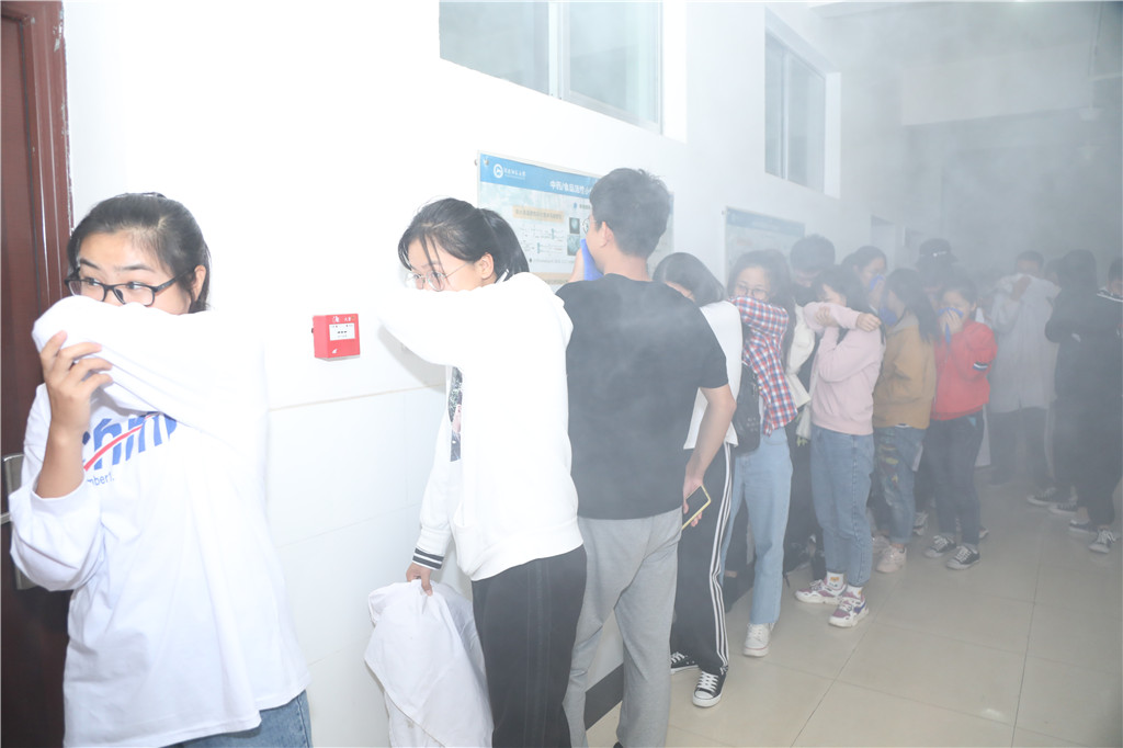 参演人员来到化工楼四楼就位,随后现场释放无毒害烟饼,模拟实验室意外引起火灾的情形。协调保障组老师迅速模拟拨打火警电话,并通知拉响警报、广播通知全体疏散。人员疏散组的老师现场分发毛巾等消防用具,组织安排学生安静有序的撤离火灾现场。灭火组与救护组的老师也携相应器具迅速抵达现场,使用手持灭火器模拟对火情进行控制,将不能行动的伤员背离现场并进行初级救护。全体学生顺利撤退到安全地带后,由人员疏散检查组的老师反复检查、清点人数,确认人员疏散完毕。校保卫处安全科科长彭健发言总结了此次疏散工作的优点与不足。