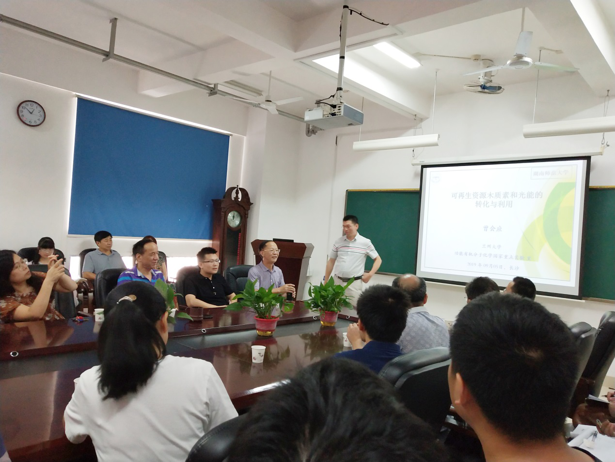 2019年9月5日上午10:00,兰州大学曾会应副教授在化工院206会议室为我院师生带来了一场题为“可再生资源木质素和光能的转化与利用”的学术报告,报告由尹笃林教授主持,英国365集团部分老师、研究生聆听了此次报告。