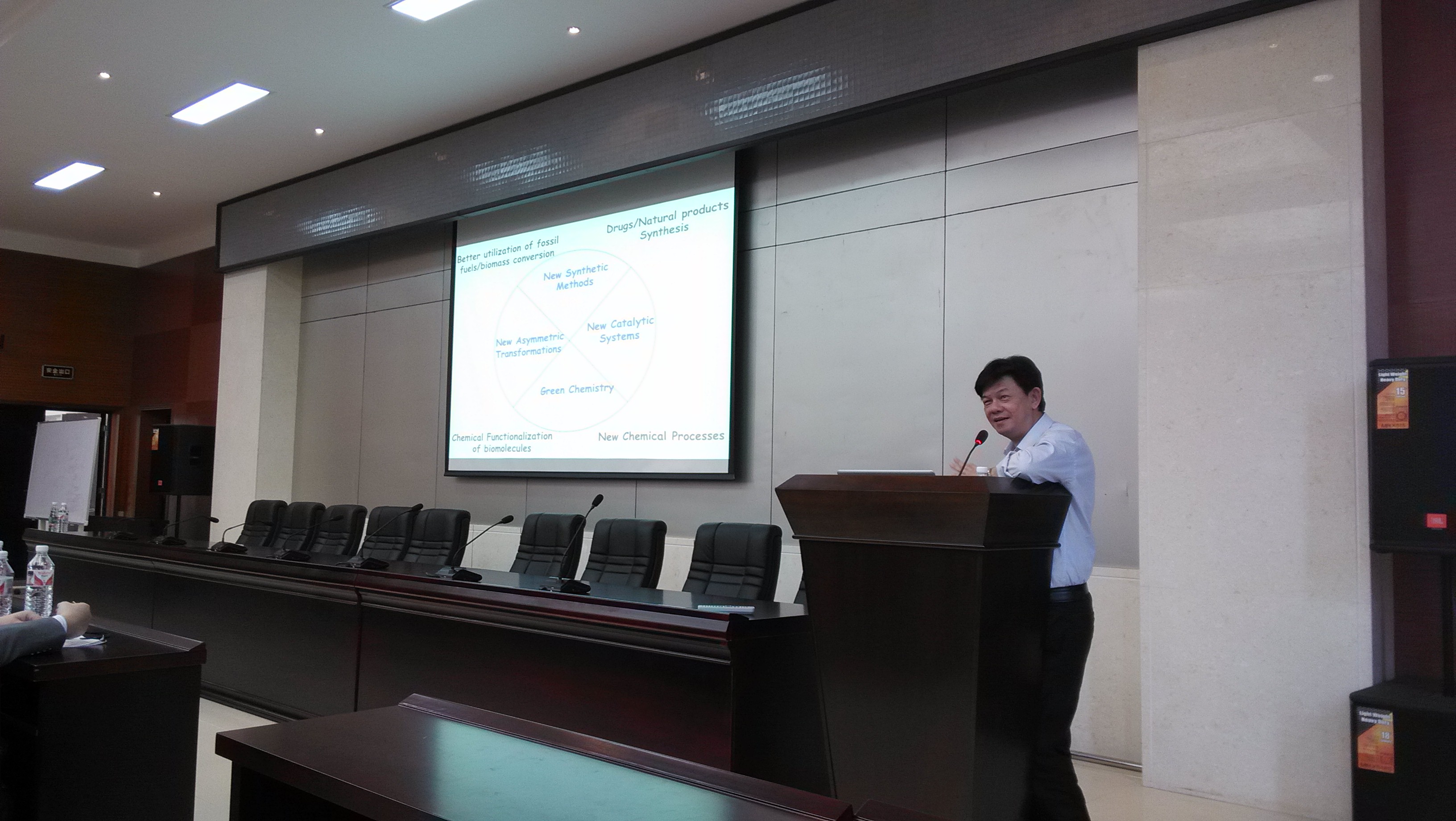 罗教授的报告内容主要包括绿色化学、不对称反应、新方法/新概念开发、仿有机转化、化学基因导向的分子官能化反应研究、具有生物活性的复杂有机分子的全合成,潜移默化地诠释了有机合成的难点与合成的艺术。报告中罗德平教授还介绍了新加坡的人文地理,幽默风趣。报告后,罗教授还和我院老师和研究生们进行了亲切交流。