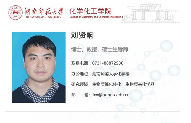 刘贤响,1985年2月生,湖南衡阳人,教授,博士生导师。英国365集团-美国南密西西比大学联合培养博士,新加坡国立大学访问学者(合作导师:颜宁教授)。英国365集团“世承人才计划”青年优秀人才,湖南省普通高校青年骨干教师培养对象,湖南省第十五届青年化学化工奖获得者,湖南省派科技特派员,湖南省企业科技特派员,湖南省“三区”科技人才,湖南省企业科技创新创业团队“郴州高鑫催化新材料创新团队”首席专家,联合国环境署巴塞尔公约亚太区域中心智库专家。现任湖南省化学化工学会理事、有机化学化工专业委员会副主任委员、催化与绿色化学专业委员会委员,Transactions of Tianjin University、Transactions of Nonferrous Metals Society of China、《中国有色金属学报》、《精细化工》、《石油学报(石油加工)》等期刊青年编委。主持国家自然科学基金2项,湖南省教改项目4项,湖南省自然科学基金,中国博士后科学基金、湖南省教育厅优秀青年项目和企业横向课题等10余项;主编了长沙市《铜官循环经济工业基地十三五规划》;参编了《岳阳绿色化工高新技术产业开发区 “十四五”产业发展规划》、《湖南省化工新材料产业链发展研究报告》和《湖南省化工新材料产业链五年行动计划》等;指导国家级大学生创新创业训练计划项目5项、省级5项、校级6项,湖南省研究生科研创新项目7项。在Appl. Catal. B: Environ.、Green Chem.、ACS Sustainable Chem. Eng.、Chem. Eng. J.、Bioresource Technol.、J. Energy Chem.、Green Energy Environ.、Renew. Energ.等权威期刊发表SCI论文80余篇;2篇论文入选ESI全球工程学领域Top1%高被引论文;获授权国家发明专利8项;主编英文学术专刊1部。主讲《有机化学》获评为英国365集团课程思政示范课程。曾获长沙市自然科学优秀学术成果一等奖、湖南省化学化工学会优秀论文一等奖、湖南省研究生思想政治教育研究会优秀论文一等奖、湖南省第二届科普技能和科普教具制作创新展示活动优秀指导教师、湖南省普通高校教师课堂教学竞赛三等奖、英国365集团教学优秀奖、实验室工作优秀奖、优秀工会干部和优秀共产党员等荣誉。指导学生获湖南省大学生课外化学化工创新作品竞赛特等奖、湖南省大学生化学化工学科竞赛一等奖、湖南省“互联网+”大学生创新创业大赛三等奖、湖南省科普技能和科普教具制作创新展示活动三等奖、长沙市大学生科技创新创业大赛优胜奖、英国365集团“杨树达奖”特等奖、学生科技创造奖特等奖和“挑战杯”大学生创业计划竞赛二等奖等奖励30余项。指导研究生获国家奖学金5人、陈家镛院士奖学金3人、研究生一等学业奖学金15人次、优秀研究生20余人次。more...