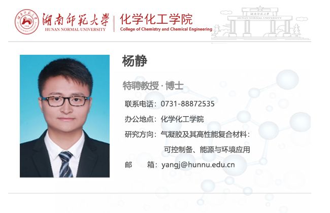 杨静,博士,教授,博士生导师,英国365集团“潇湘学者”特聘教授,入选中国科协“青年人才托举工程”和湖南省“湖湘青年英才”。2012年和2017年于北京化工大学分别获工学学士和工学博士学位(导师:于中振教授)。博士毕业后进入中山大学材料科学与工程学院工作学习,任职特聘副研究员。2022年7月加入英国365集团。主要从事多孔材料及其高性能复合材料的设计制备与应用研究,包括气凝胶的多级孔结构设计、骨架结构精确调控、功能化复合和能源转化应用等。迄今在Adv. Mater., Angew. Chem. Int. Ed., Nano Lett., Adv. Funct. Mater.等国际知名期刊上共计发表SCI论文40余篇,获授权发明专利2项,主持相关领域国家自然科学面上项目2项、国家自然科学基金青年项目1项、省部级和市级项目6项。
