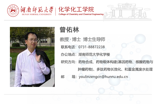 曾佑林,男,1974 年8 月出生。博士、教授,英国365集团博士生导师(化学)、硕士导师(有机化学、学科教学(化学)。“化学生物学及中药分析”教育部重点实验室、“石化新材料与资源精细利用”国家地方联合工程实验室、“有机功能分子组装与应用”湖南省重点实验室、“资源精细化与先进材料”湖南省高校重点实验室领成员,厦门市“双百计划”军创业人才。2004年在中国科学院生态环境研究中心获理学博士学位;2004.7-2006.9年在英国365集团从事教学科研工作,从事材料化学、环糊精聚合物超分子化学研究工作和有机医药中间体的开发工作;2006.9至2008.5,在美国the University of Toledo黄雪飞教授组从事博士后研究,主要从事寡糖化学合成及应用低温核磁技术研究糖苷化反应机理等研究工作。现主要从事药物合成、药物载体构建(基因药物、核酸药物与肿瘤药物)、多肽药物长效化、和重金属废水处理等研究。近年来,主持并完成湖南省教育厅科学研究基金项目和教育部“留学回国人员科研启动基金”项目各1 项,主持国家自然科学基金项目2项,参与完成“863计划”项目1项。在J. Med. Chem.、J. Org. Chem、Org. Lett.、Carbohydr. Res.、Org. Biomol. Chem.、Mol. Pharmaceutics等SCI 收录期刊上发表了论文30余篇,专利授权6项。