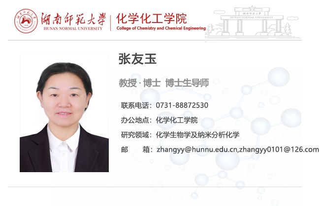 张友玉,博士,二级教授,博士生导师。主要从事化学生物学及纳米分析化学等领域的研究。主持国家自然科学基金面上项目5项,国家基金重点项目协作项目1项,省部级重点及一般项目10余项。以第一作者和通讯作者在Sci. Adv.,Angew. Chem. Int. Ed., Anal. Chem., Chem. Commun.等国际著名刊物上发表高水平研究论文200余篇,获国家授权发明专利7项。获湖南省自然科学奖二等奖1项,湖南省科学技术进步奖二等奖1项,中国分析测试学会科学技术奖(CAIA奖)二等奖1项。获2018年英国365集团芙蓉百岗明星称号。