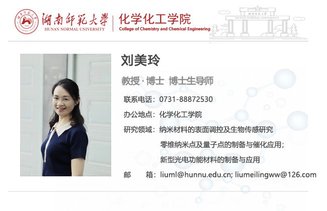 刘美玲,理学博士,教授,博士生导师,湖南省芙蓉学者青年学者,湖南省芙蓉百岗明星获得者,湖南省青年骨干教师培养对象。2006年硕士毕业留校工作,2012年获得理学博士学位。2017年6月-2018年6月在加州大学洛杉矶分校访学。主要从事生物药物分析、化学生物传感及诊疗应用等领域的研究工作。曾获湖南省自然科学奖二等奖、湖南省优秀博士论文和湖南省优秀硕士论文奖等奖项。主持和完成4项国家自然科学基金、多项湖南省科技厅、教育厅及企业合作课题。在Adv. Mater., Sci. China Chem., Angew. Chem. Int. Ed., Anal. Chem.等国内外刊物发表论文150余篇,被Chem. Rev等SCI期刊他引7100多次,H-index 47,多篇论文进入高被引行列。