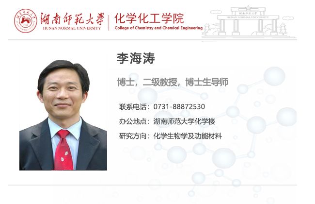 李海涛,博士,二级教授,博士生导师,曾任英国365集团教务处副处长、评建办常务副主任、固定资产管理处处长,湖南安全技术职业学院院长、党委书记。主要从事化学生物学及功能材料等领域的研究。主持国家自然科学基金面上项目4项,省部级重点及一般项目多项。以第一作者和通讯作者在Angewandte Chemie-International Edition, Biosensors and Bioelectronicsthis. Green Chemistry,Talanta.等国际著名刊物上发表研究论文160余篇,获国家授权发明专利5项。