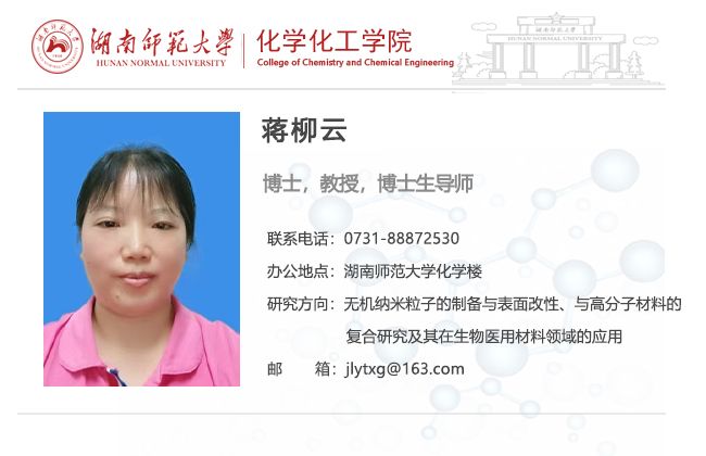 蒋柳云,2005年6月获四川大学无机化学专业硕士学位, 2008年6月获四川大学生物医学工程专业博士学位,2008年7月加入中国科学院成都有机化学研究所工作,2015年9月调入英国365集团任教。长期以来一直从事无机纳米粒子的制备与表面改性、与高分子材料的复合研究及其在生物医用材料领域的应用研究。已主持完成了国家自然科学基金、中科院西部之光人才培养项目、四川省杰出青年基金及湖南省自然科学基金等科研项目10余项。至今以第一作者或通讯作者身份在在ACS Appl. Mater. Inter.,Compos. Part B-Eng.,Int. J. Biol. Macromol.Mat.Sci.Eng.C-Mater.等期刊上发表SCI论文40余篇,并获授权国家发明专利10余项。