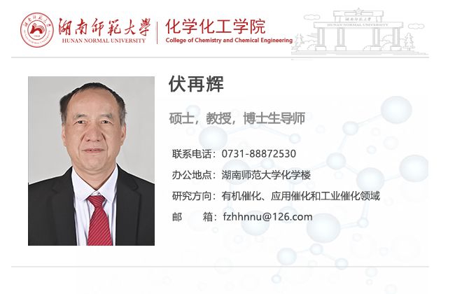 伏再辉,54岁,硕士,二级教授,有机化学博士生导师。“石化新材料与资源精细利用”国家地方联合工程实验室副主任,“资源精细化与先进材料”湖南高校重点实验室副主任,精细催化合成研究所副所长。湖南省2011协同创新中心“环境友好与资源高效利用化工新技术”首席专家,学校世承人才计划学术骨干。1988年在中科院大连化学物理研究所催化专业硕士毕业。长期从事有机催化、应用催化和工业催化领域的科研与教学工作,在新型催化材料的分子设计、绿色催化氧化、仿酶催化转化等方面硕果累累,一批原创性的研究成果引起国内外同行的高度关注。先后主持完成5项国家自然科学基金和湖南省自然科学基金重点课题、高等学校博士学位点专项科研基金和湖南省教育厅高校重点实验室平台课题,以及与中石化企业的合作研究课题。发明了一类具有催化分子开关结构特征的新一代烯烃环氧化高效的环境友好催化剂,发展了基于分子氧的选择氧化的绿色光催化反应体系和基于生物质炭磺酸催化木质纤维类生物质水解的高效仿酶催化转化体系。提出的“催化剂活性基团的仿生组装”思想被10000个科学难题编委会收录(湖南省仅3人)。在国际重要刊物J. Catal., Adv. Synth. Catal., Green chem., Applied catalysis B-environ., Appl. Catal. A: Gen., J. Mol. Catal. A: Chem., Ind. Eng. Chem. Res., cellulose 等杂志上发表与催化有关的论文40多篇。获2010年度湖南省自然科学三等奖1项。指导1名硕士研究生获湖南省优秀硕士毕业论文、2名博士研究生获国家奖学金,2名硕士研究生获英国365集团优秀硕士毕业论文。目前在有机化学、应用化学、工业催化等方向招收硕士研究生,有机化学方向招收博士研究生。